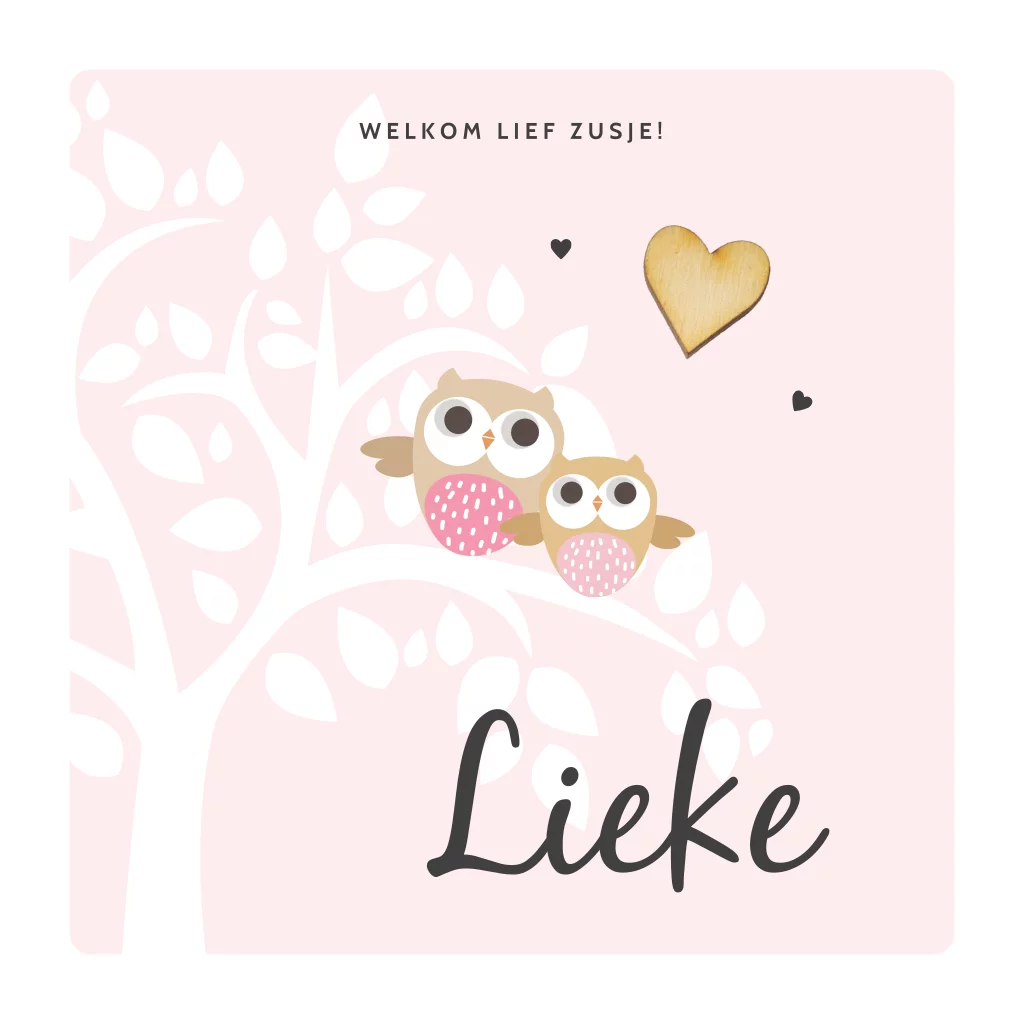 Romantisch geboortekaartje voor een klein zusje met zacht roze achtergrond en silhouet van een boom. In de boom zit een grote uil met een klein uiltje. Het hartje op de kaart is een echte houten hartje.