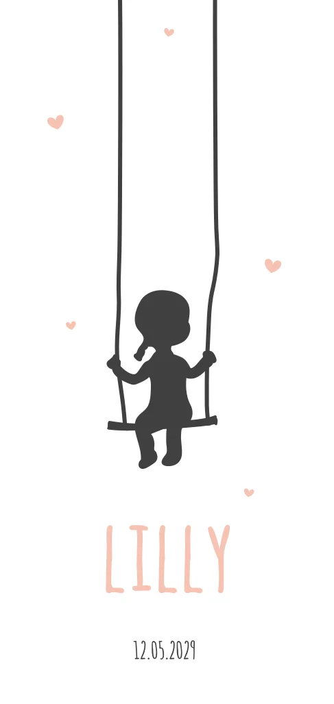 Vrolijk geboortekaartje voor een meisje met roze letters, een foto en een silhouet van een meisje op een schommel omringd door hartjes.