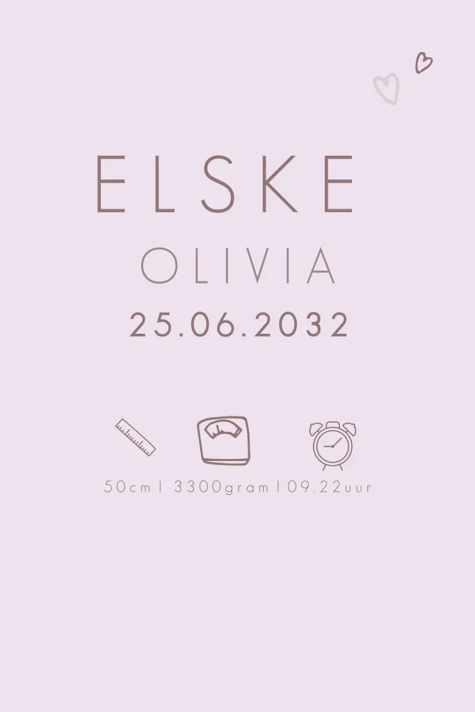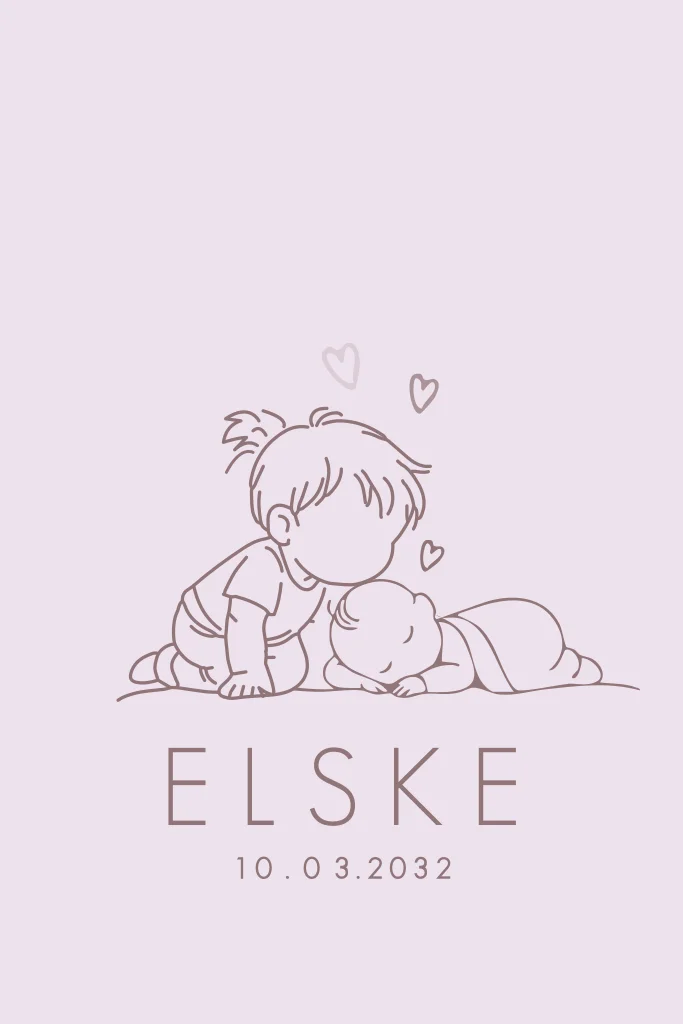 Een teder geboortekaartje voor een meisje, met een lijntekening waarop haar grote zus haar kleine zusje een liefdevol kusje geeft. Het minimalistische en zachte design benadrukt de warme band tussen de zusjes. Pas het ontwerp eenvoudig aan naar eigen wens in onze online editor.