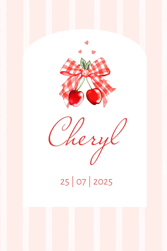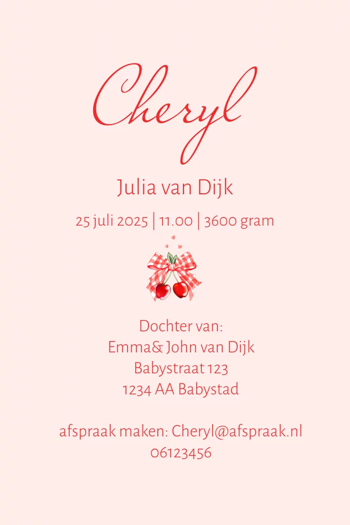 Geboortekaartje meisje met kersjes aan leuk strikje. Met streeppatroon in warm roze.