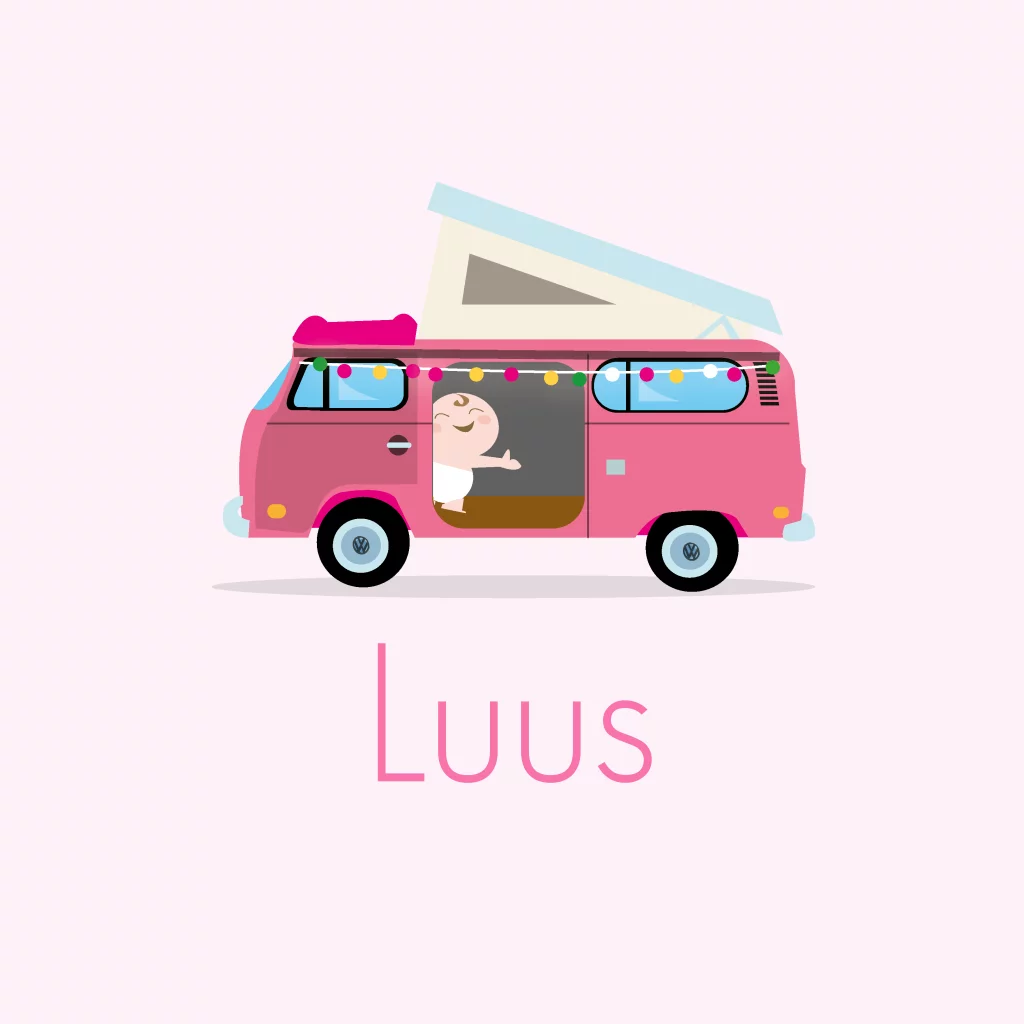 Eenvoudig geboortekaartje met een getekend westfalia t1 volkswagenbusje met een getekende baby erin, voor ouders die er graag met de camper tussenuit gaan. (3309)
