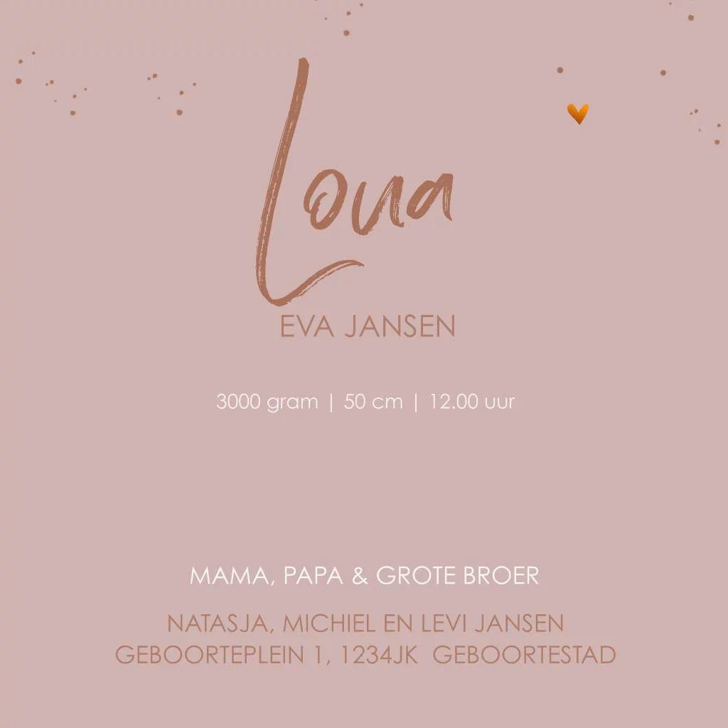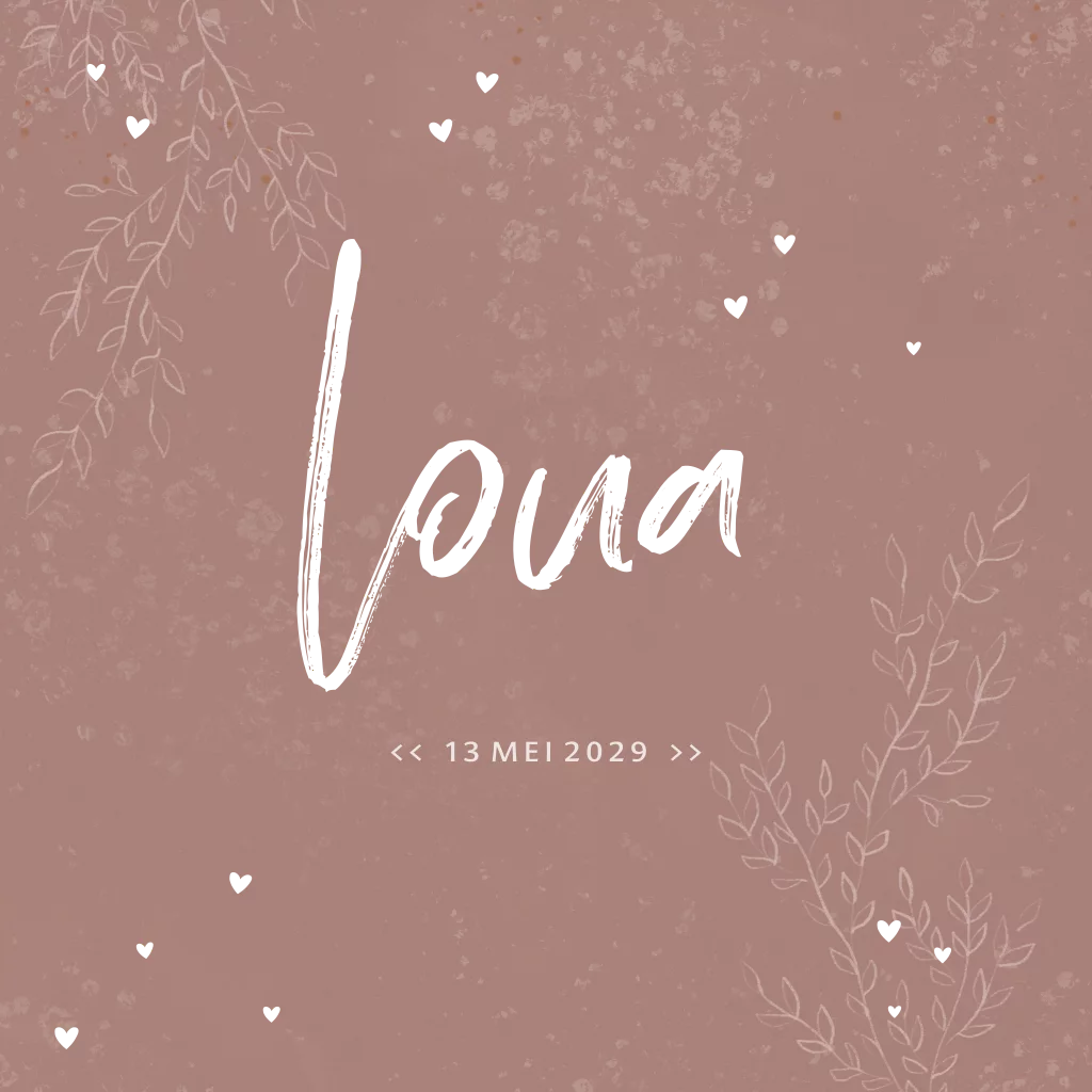 Geboortekaartje meisje Loua met takjes foliedruk op mooi oud roze achtergrond. (4160)
