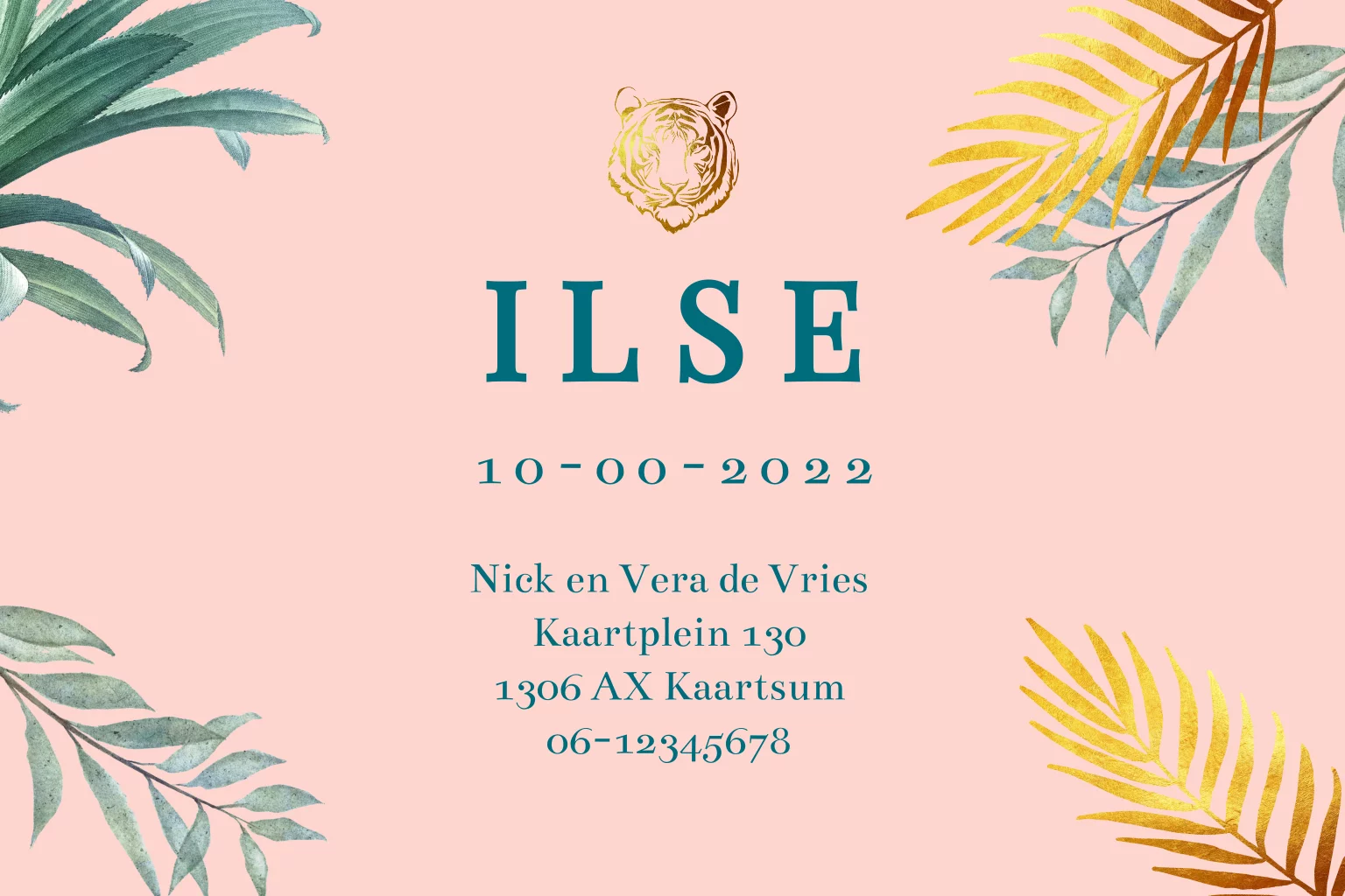 Maak deze botanische geboortekaart met gouden tijger en goud accenten voor jullie kleine wonder. (3090)