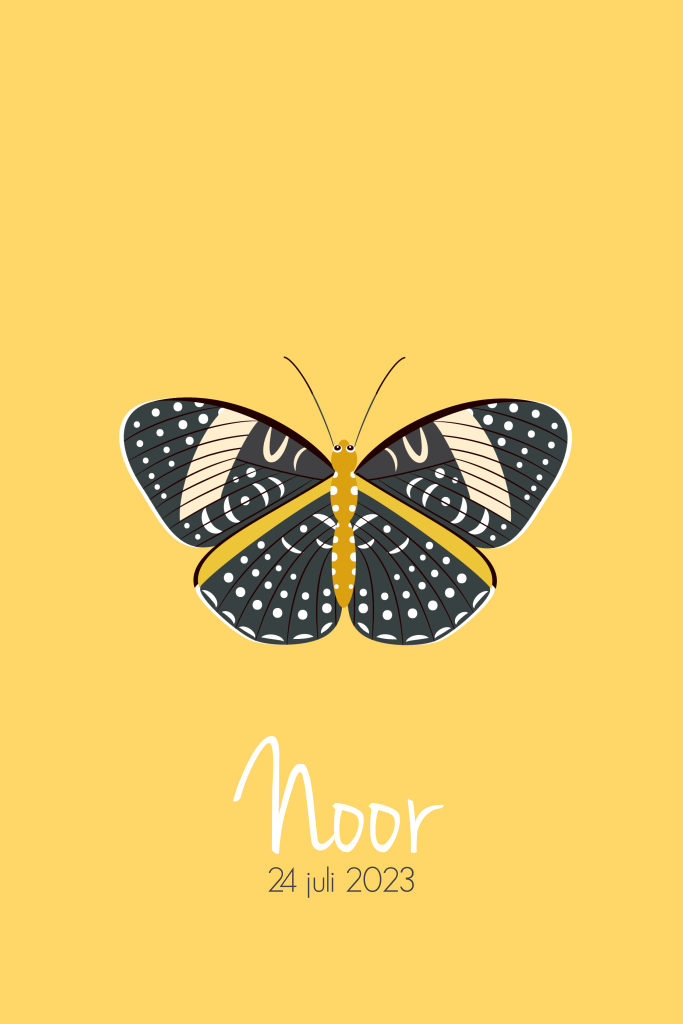 Geboortekaartje met vlinder illustratie. Tekst en achtergrondkleur volledig naar wens aan te passen. Ook prachtig in lichtroze en mintgroen. (3594). Dit geboortekaartje heeft standaard ronde hoeken (meerprijs โฌ 0,25). Wil je rechte hoeken? Neem contact met ons op.