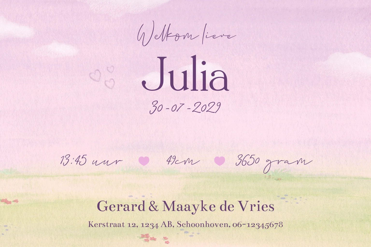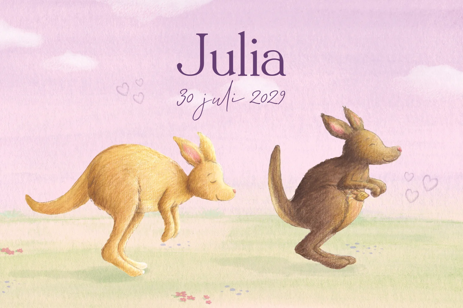 Een charmant en speels geboortekaartje voor een meisje met lieve kangoeroes waarvan één die haar kleintje beschermend in de buidel draagt, een hartverwarmend symbool van bescherming, verbinding en tederheid. De zachte roze kleur geeft het ontwerp een warme, vrouwelijke uitstraling. Pas het ontwerp eenvoudig aan naar eigen wens in onze online editor.
