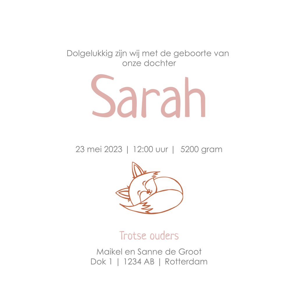 Geboortekaartje meisje met waterverf warm roze en vosje. (4126)