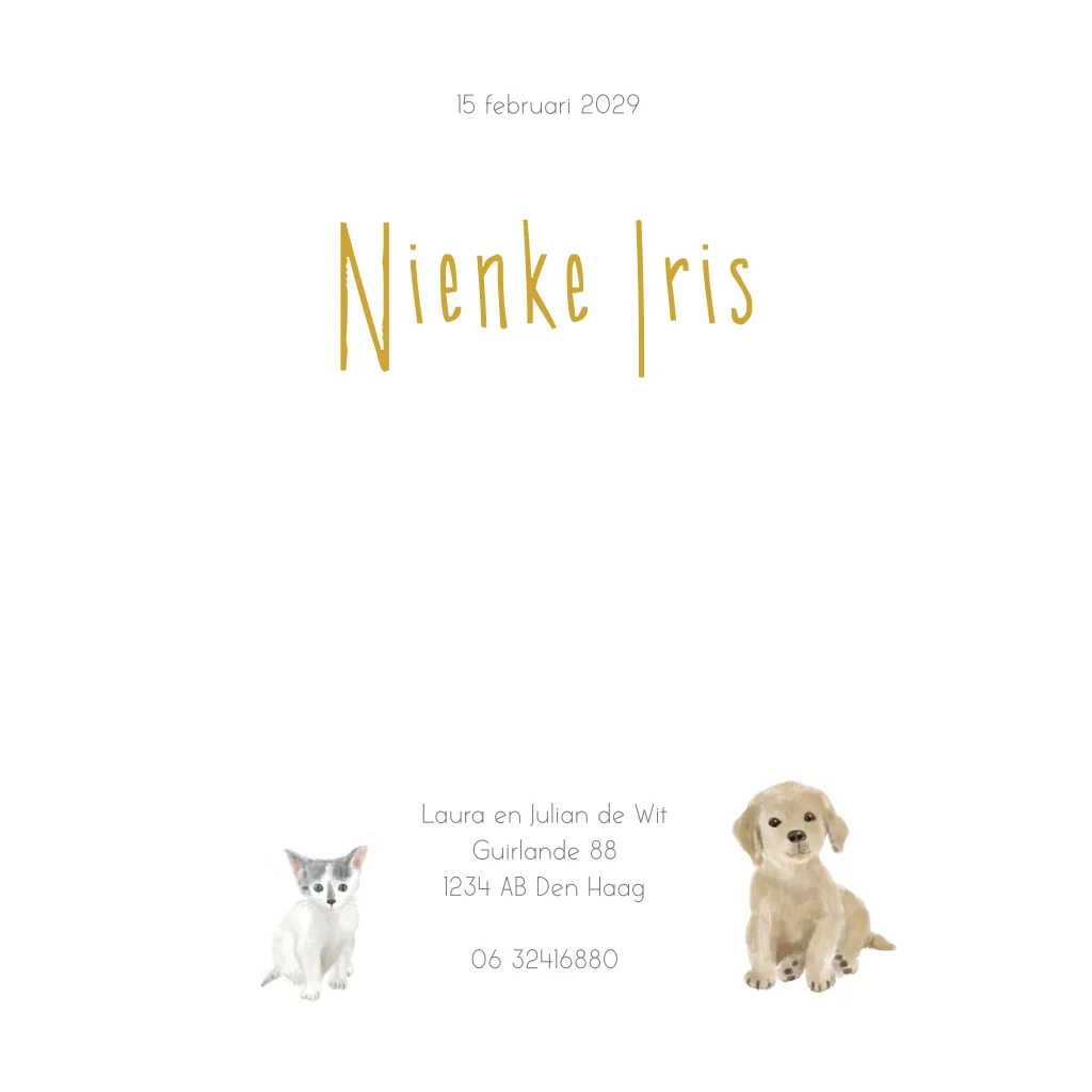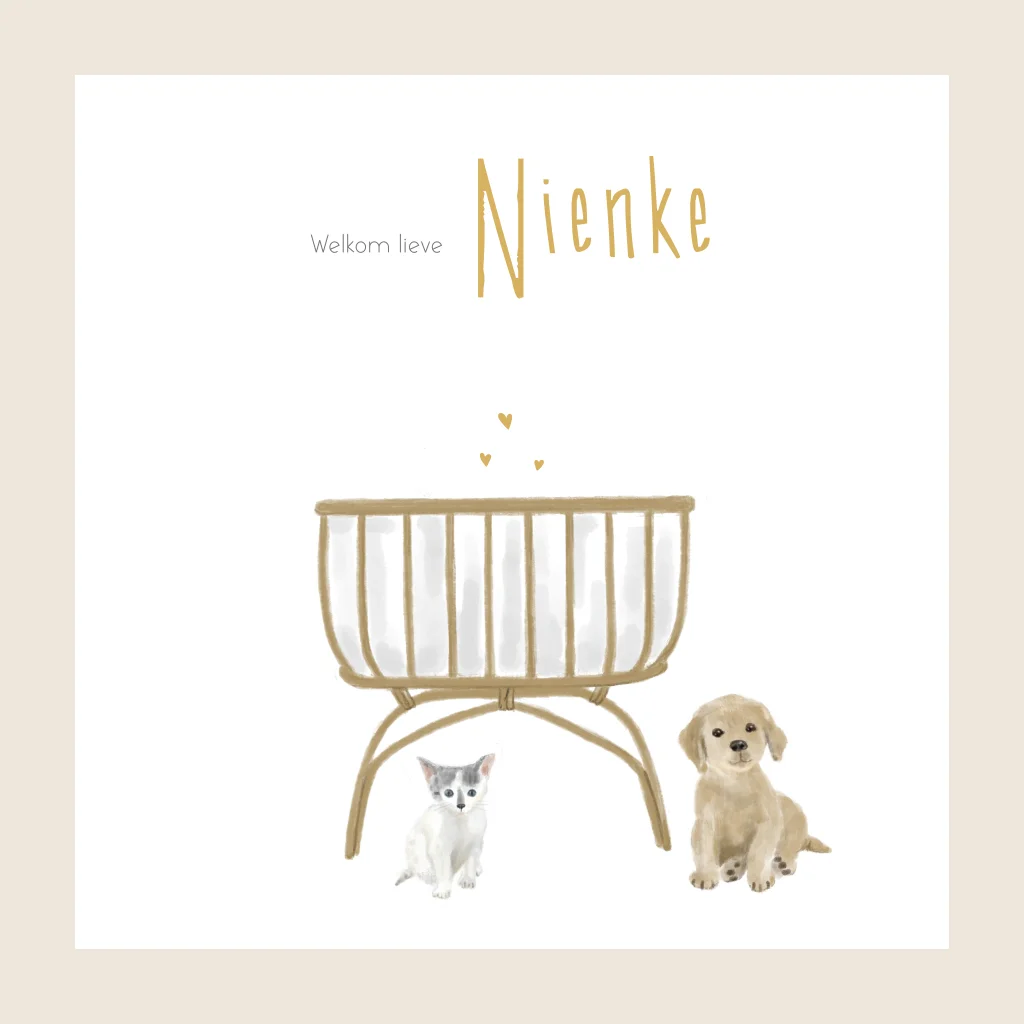 Een lief geboortekaartje voor een meisje met een warm tafereel van een wiegje, kat en hond in zachte beige tinten.