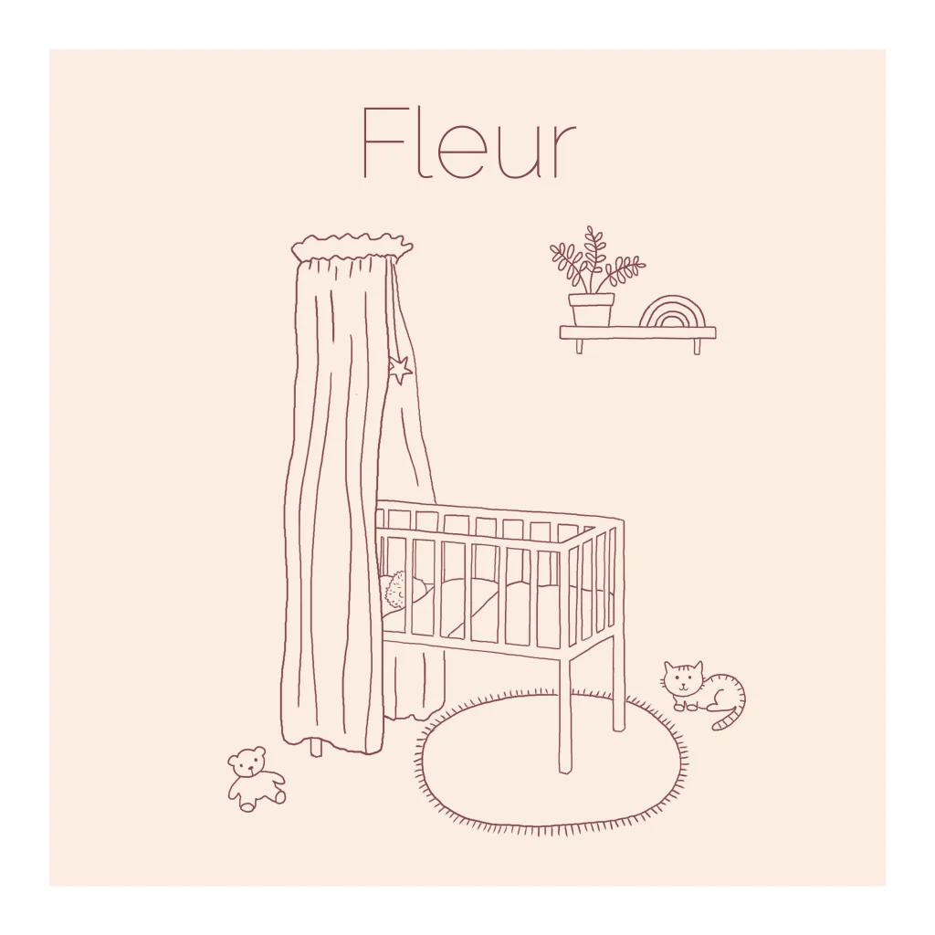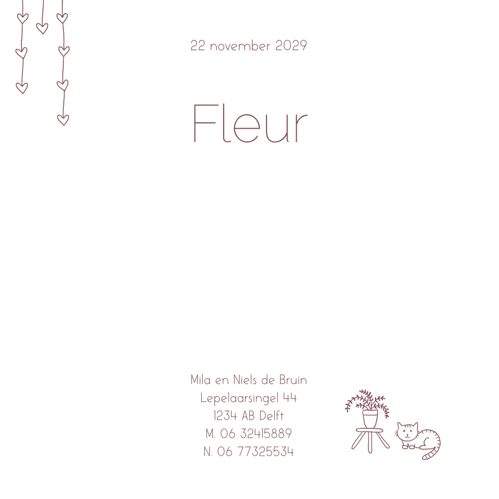 Een warm geboortekaartje voor een meisje met een zachte lijntekening van een baby in een wieg, samen met een katje en een lieve teddybeer. Pas het ontwerp eenvoudig aan naar eigen wens in onze online editor. Uit de speciale huisdieren collectie 'Thuis is met jou 🐾.