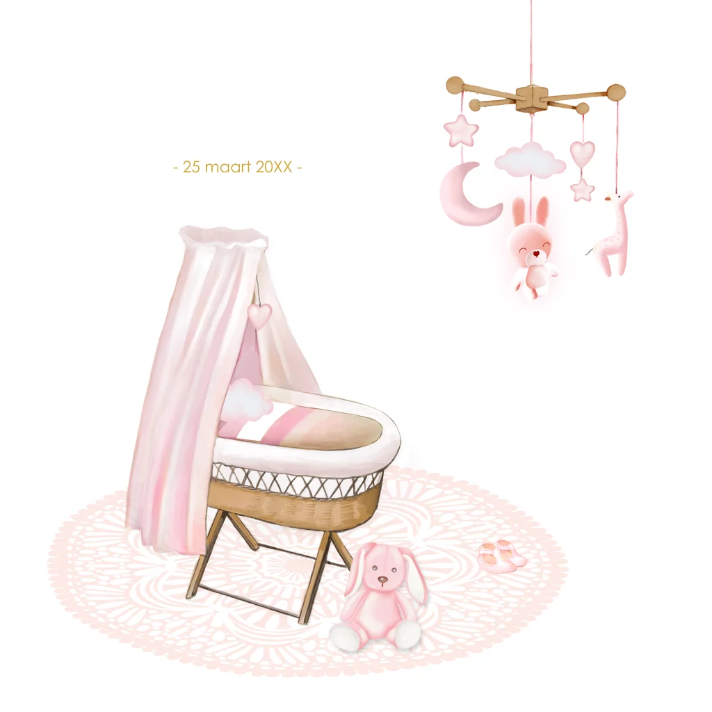 Geboortekaartje meisje met leuk wiegje en mobiel. (4083)