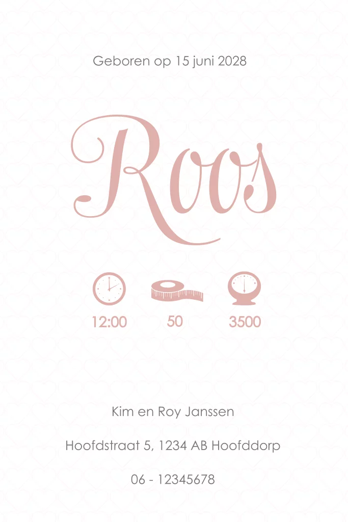 Schattig en klassiek kaartje voor de geboorte van je dochtertje met romantische hartjes patroon in zacht roze. Het echte strikje maakt dit kaartje helemaal af!