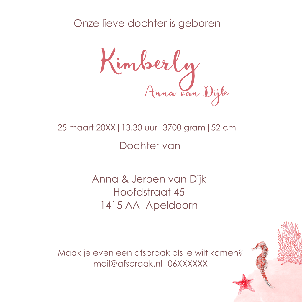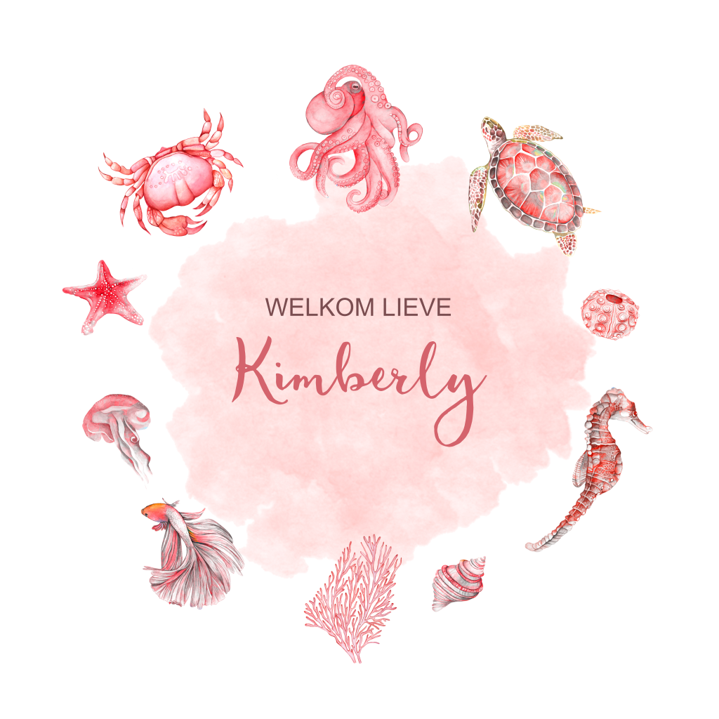 Lief geboortekaartje met leuke zeediertjes in het koraalroze voor een meisje. (4037)