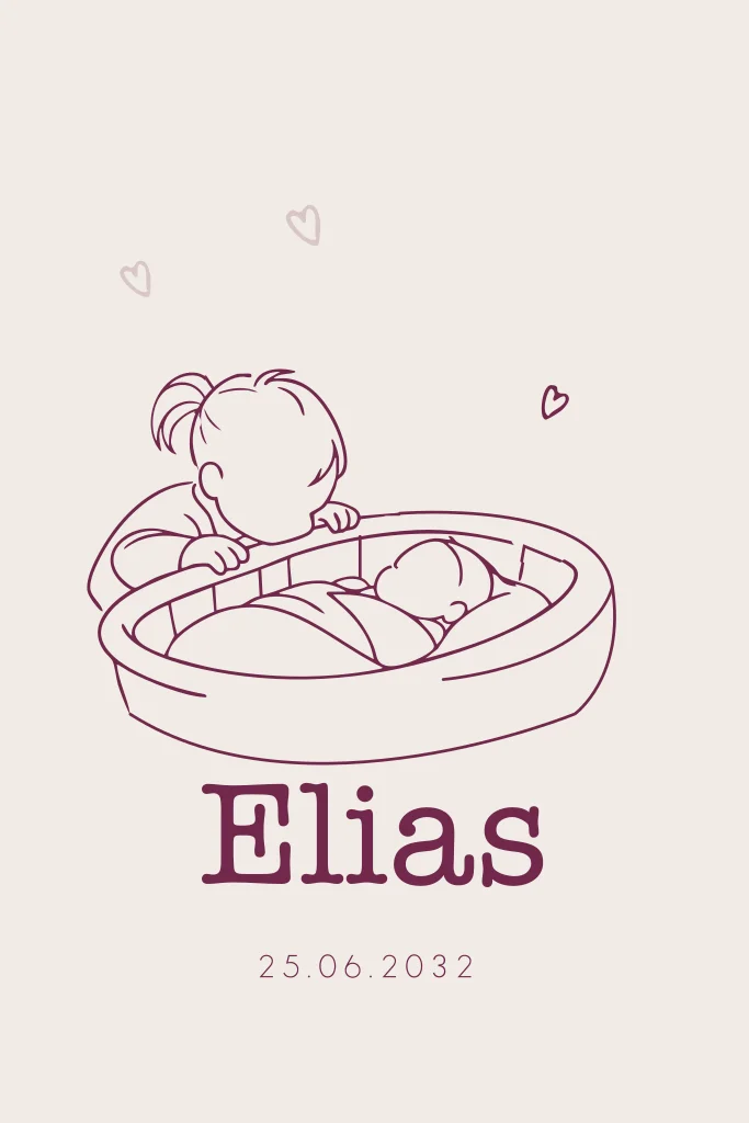 Een aandoenlijk geboortekaartje voor een meisje met een subtiele lijntekening van een grote zus die nieuwsgierig bij het wiegje van haar kleine zusje kijkt. Het ontwerp heeft een zachte, minimalistische uitstraling. Pas het ontwerp eenvoudig aan naar eigen wens in onze online editor.