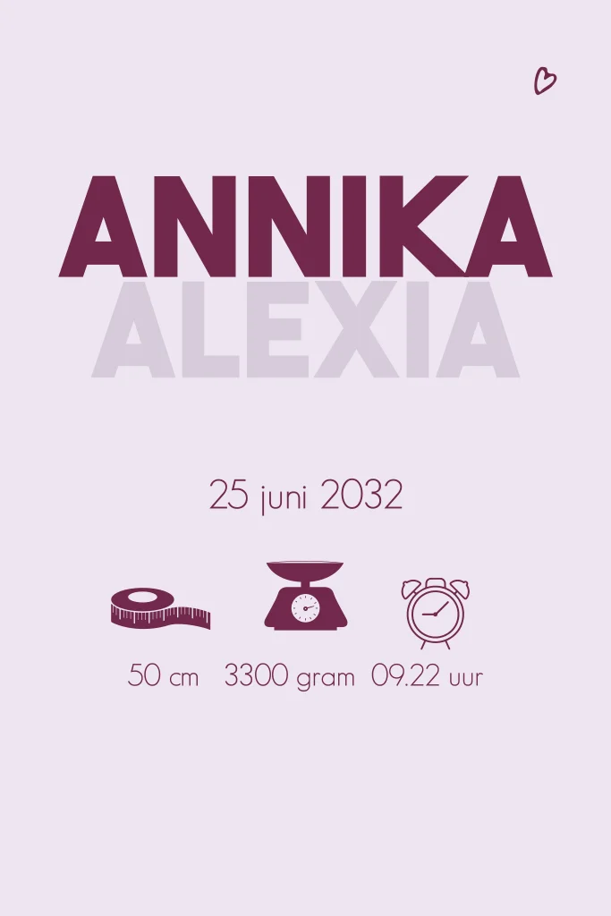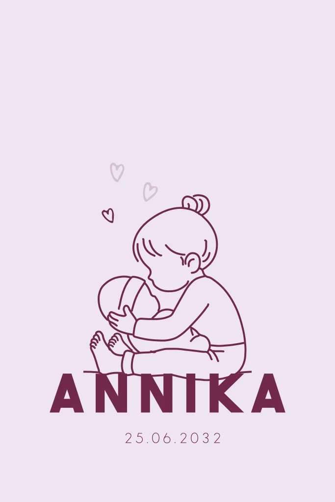 Een liefdevol geboortekaartje voor een meisje met een lijntekening van een trotse grote zus die haar kleine zusje knuffelt. Het ontwerp straalt liefde en verbondenheid uit en kan eenvoudig aangepast worden in de online editor.