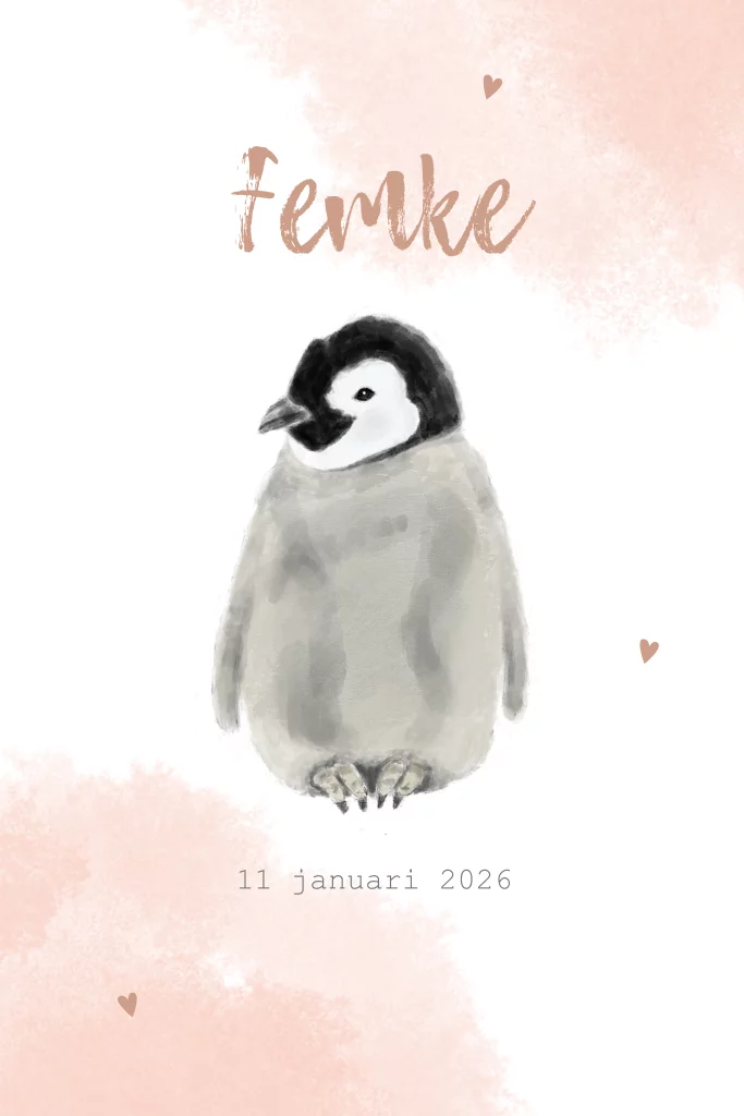 Een prachtig geschilderd winter-geboortekaartje met een pinguïn kuiken. (3713)