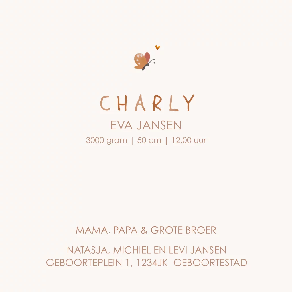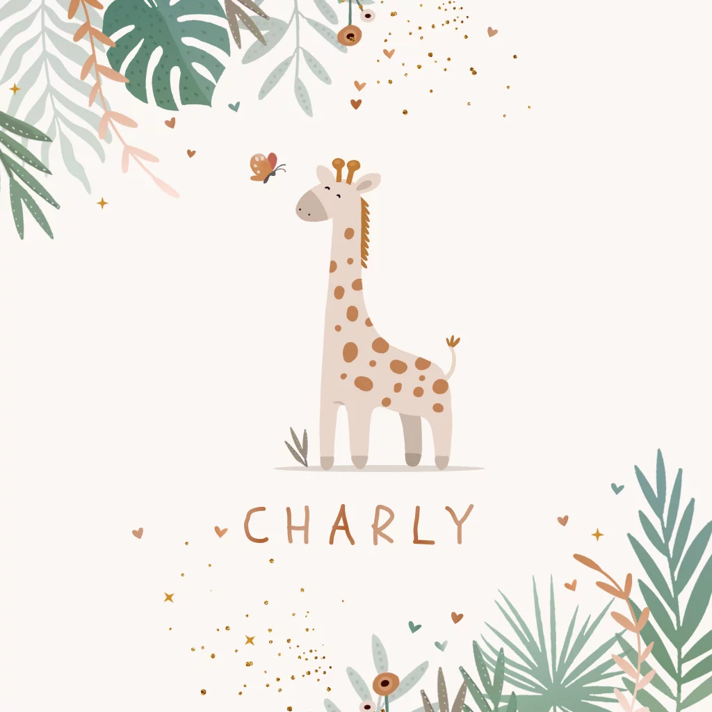 Geboortekaartje unisex neutraal girafje met vlinder en bladeren