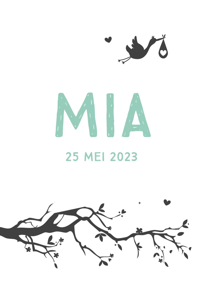 Dit simpele geboortekaartje is superleuk! Je ziet een ooievaar vliegen met een baby in de luier in zijn bek. De geboortekaart heeft ook een boomtak, wat het kaartje lekker vrolijk maakt. (999999)