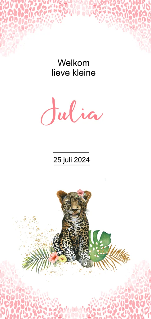 Geboortekaartje pantertje voor een meisje versierd met panterprint en de kleur is aan te passen. (3026)