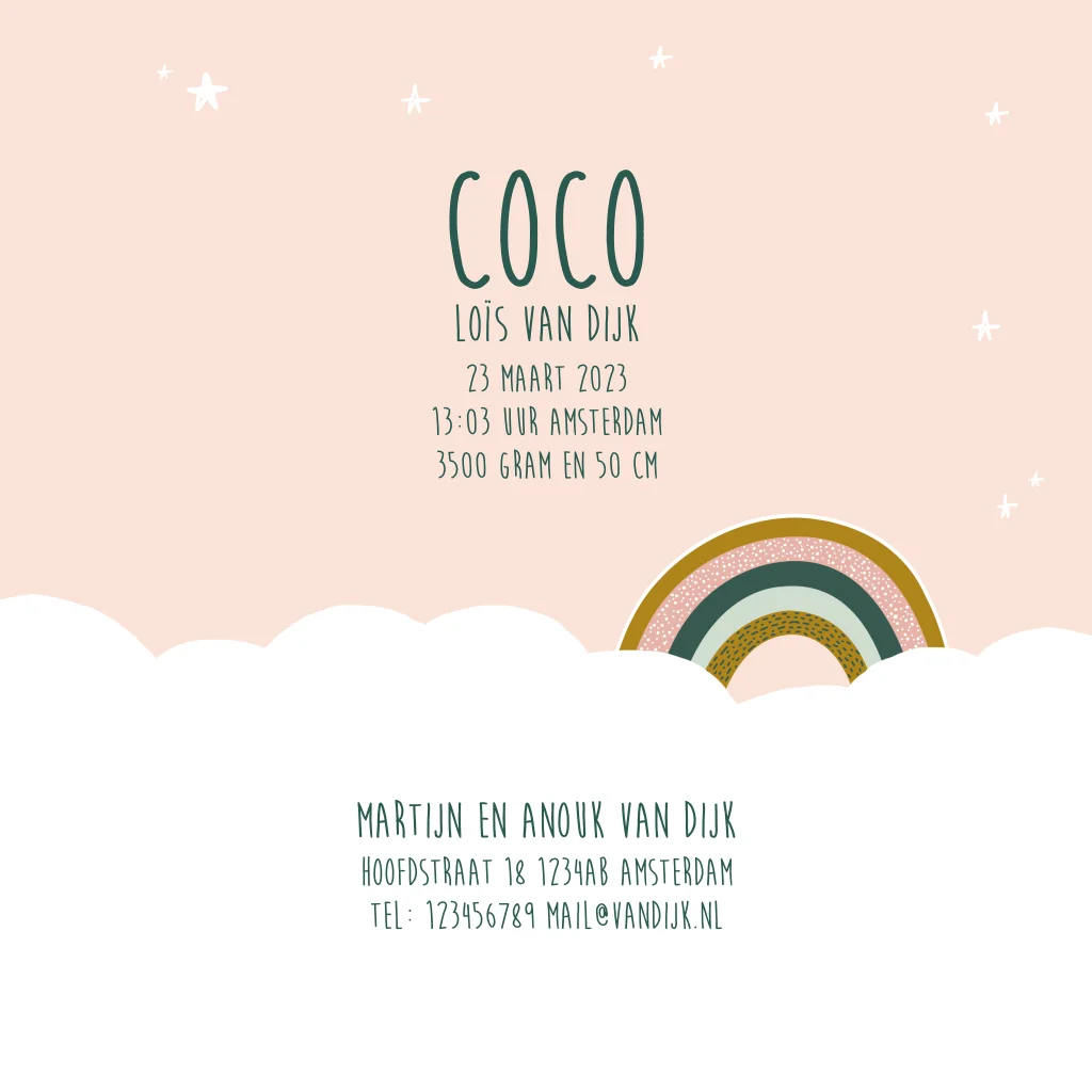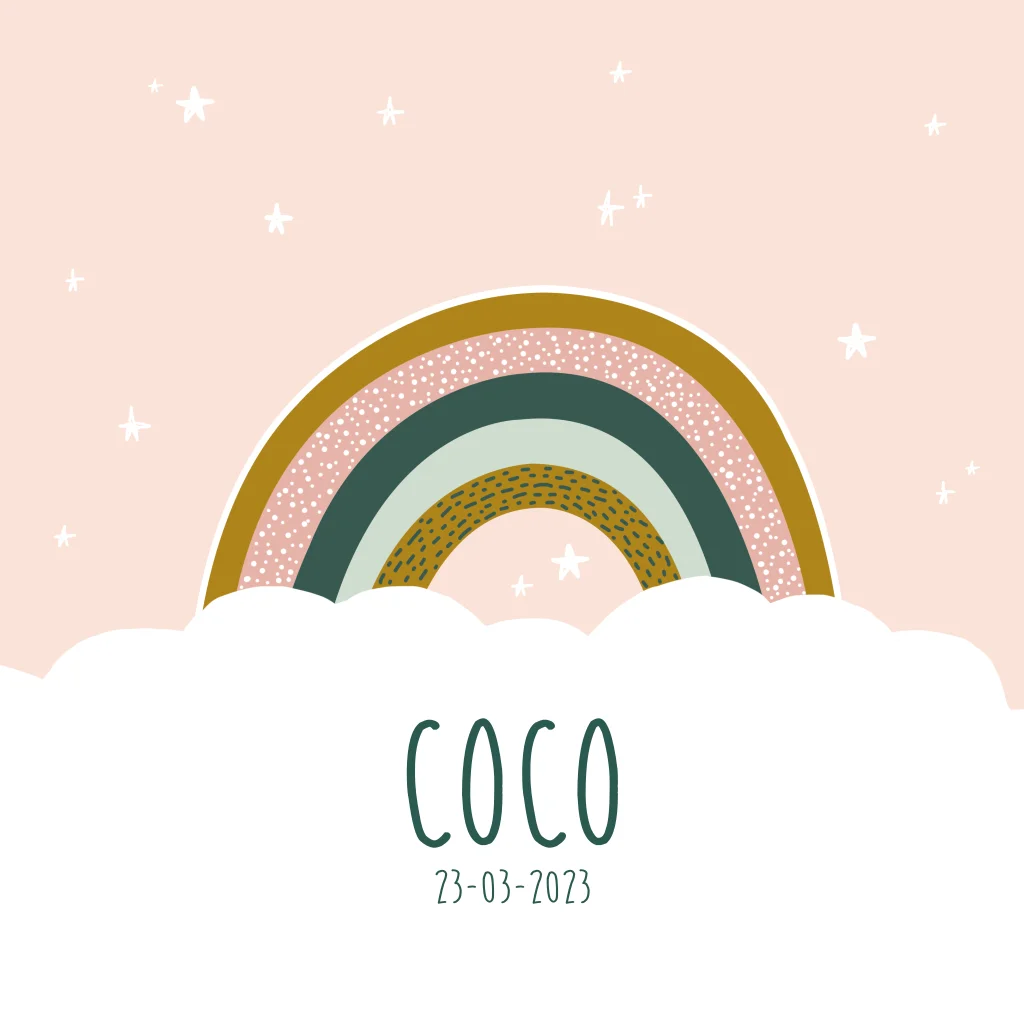 Een hip en lief geboortekaartje met regenboog, sterren en wolken. De roze achtergrondkleur is aanpasbaar. Pas ook de teksten aan. (261)