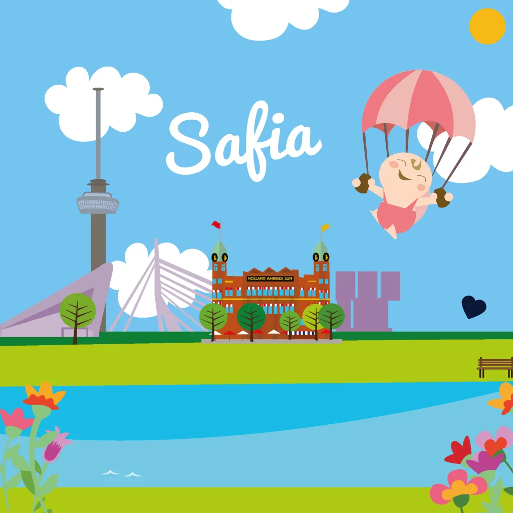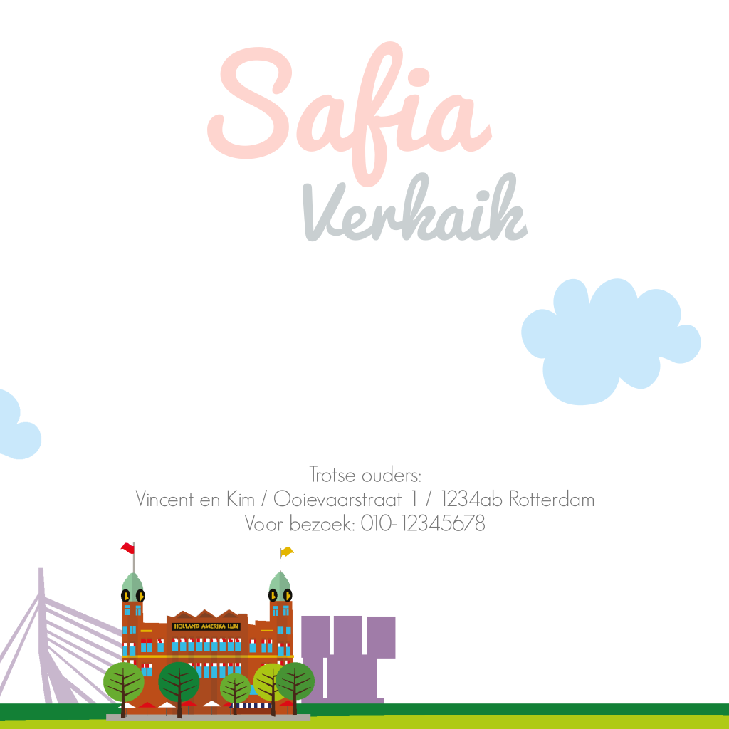 Vrolijk geboortekaartje voor een nieuwe inwoner van Rotterdam, waar een getekende baby boven de skyline van Rotterdam land, met de euromast en hotel new york uitgelicht! (3228)