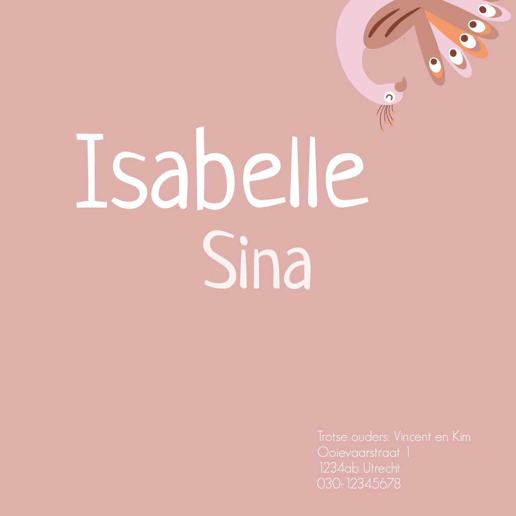 Vrolijk geboortekaartje meisje met een pauw