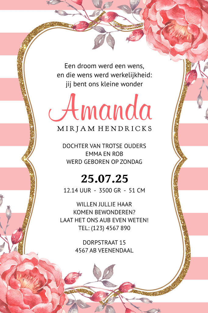 Geboortekaartje roze wit strepen en bloemen met goudkleurig randje