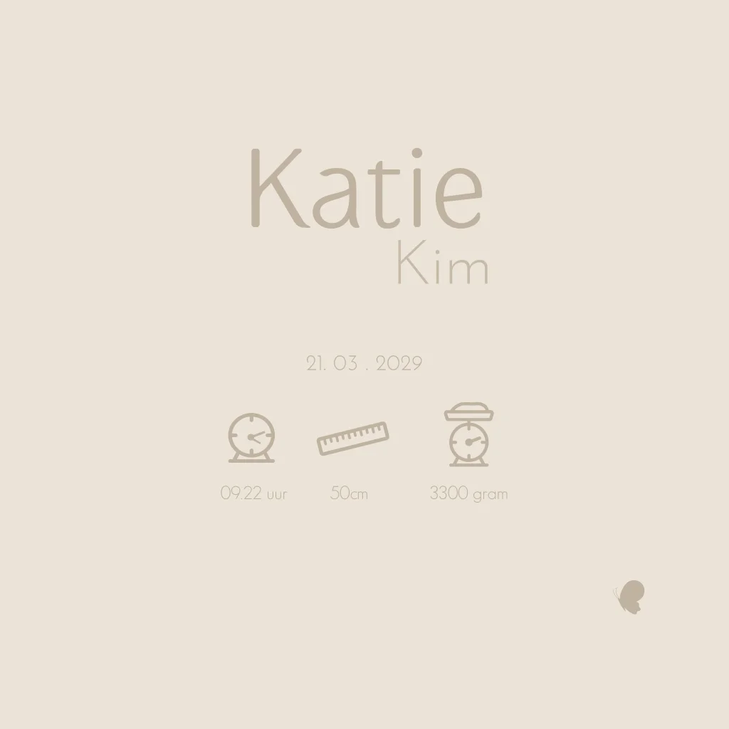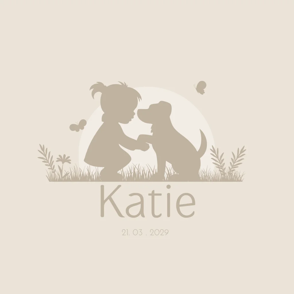 Een schattig geboortekaartje met een silhouet van een meisje en haar hondje, omringd door vlinders in de natuur. Pas het ontwerp aan in onze online editor.