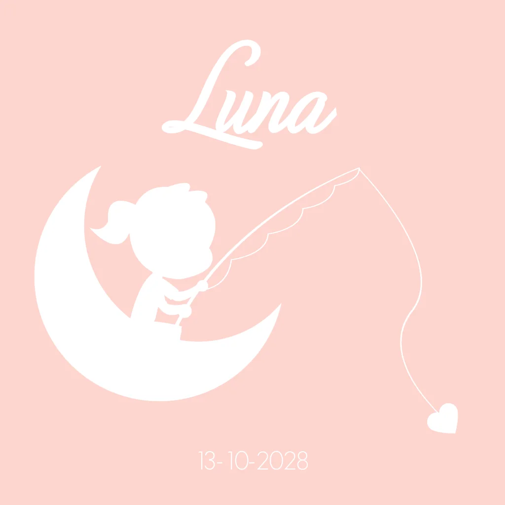 Lief geboortekaartje met een silhouet van een meisje dat op een maan zit en aan het vissen is. (3311)