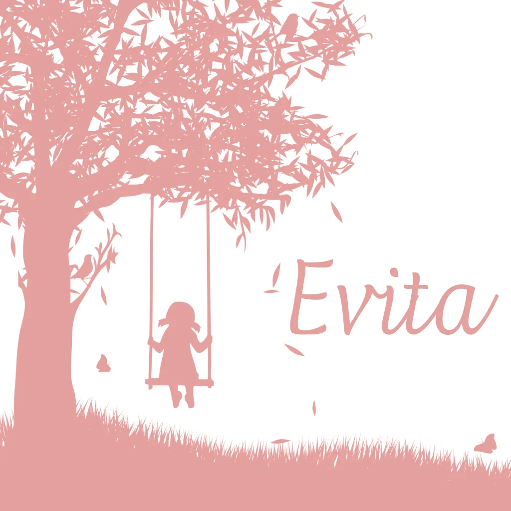 Een mooie boom en een meisje op een schommel: dat is het thema van dit lieve geboortekaartje. De vlindertjes maken het helemaal af.