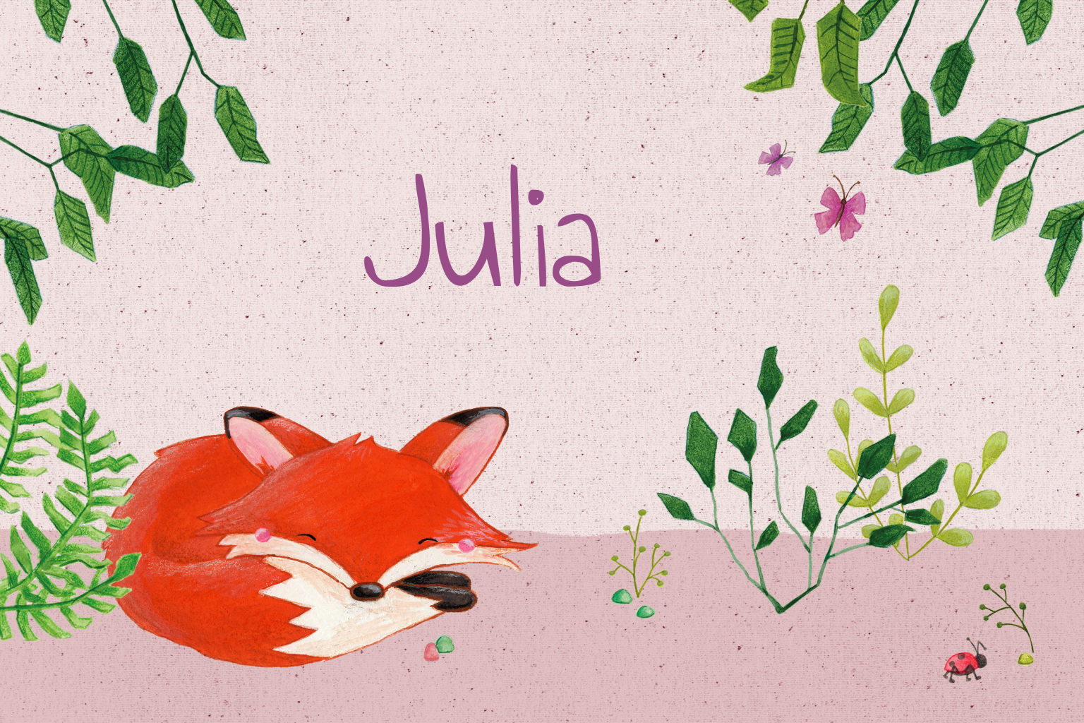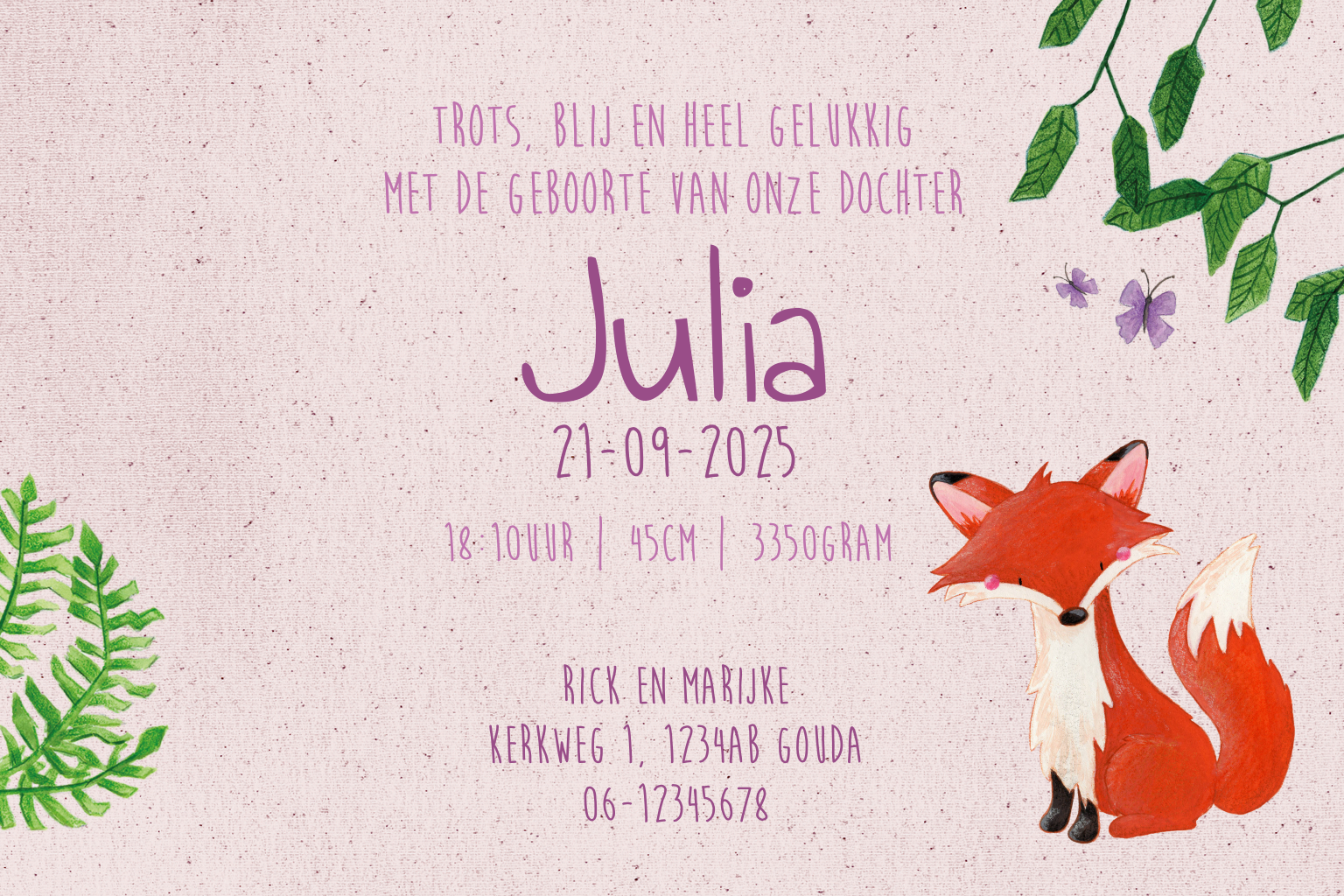 Geboortekaartje met lieve illustratie van een slapend vosje tussen de planten. Ook zijn er vlinders en een lieveheersbeestje op het kaartje terug te vinden. (3778)