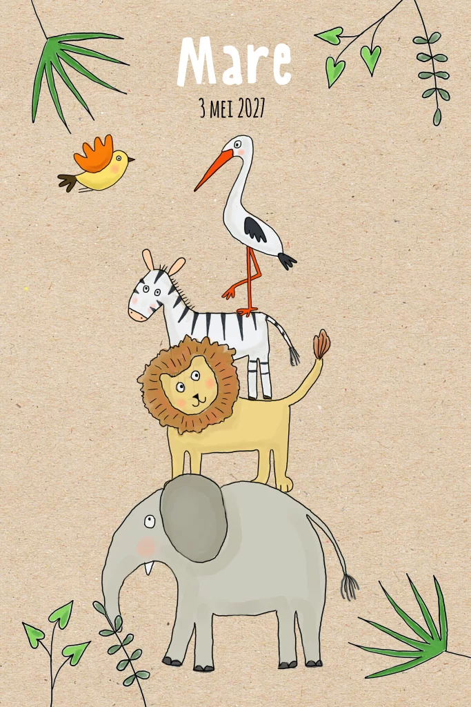 Een hip en vrolijk geboortekaartje met een stapel dieren op kraft, voor een meisje. (311)