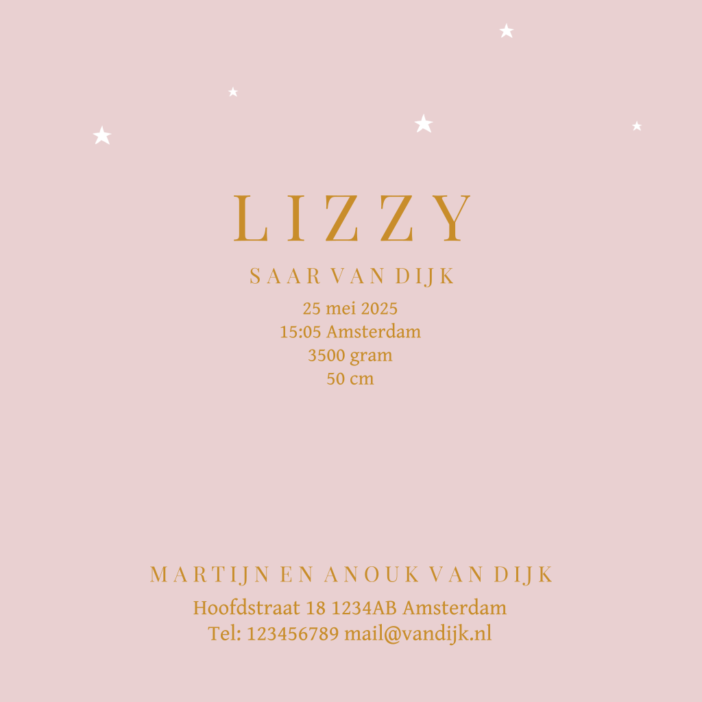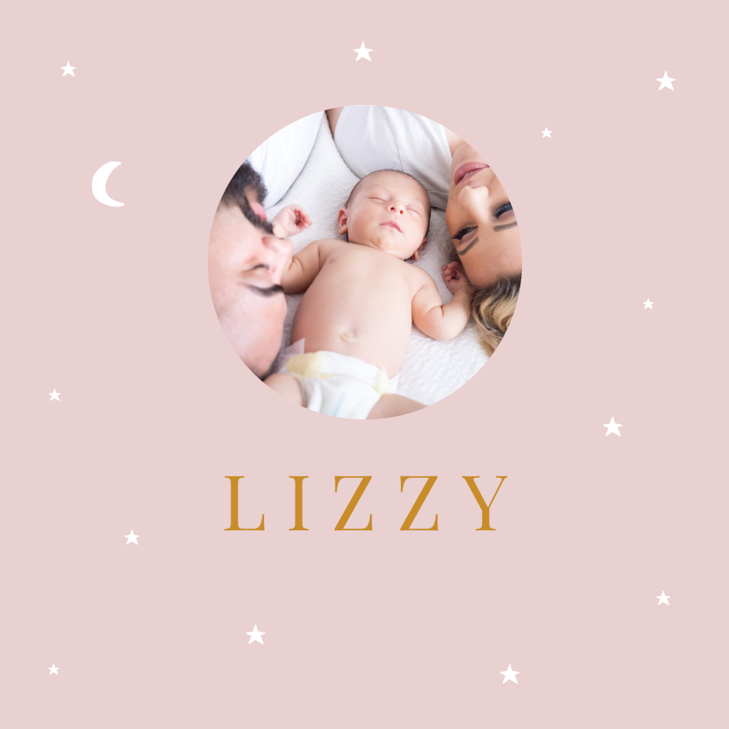 Een lief en hip geboortekaartje met sterren, maan en foto voor een meisje. Alle kleuren zijn aanpasbaar. Vervang ook de foto en pas de tekst aan. (3114)
