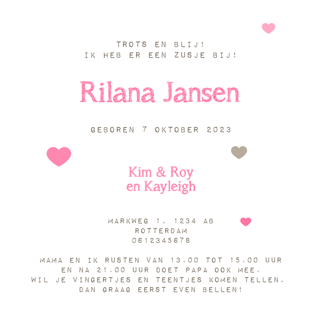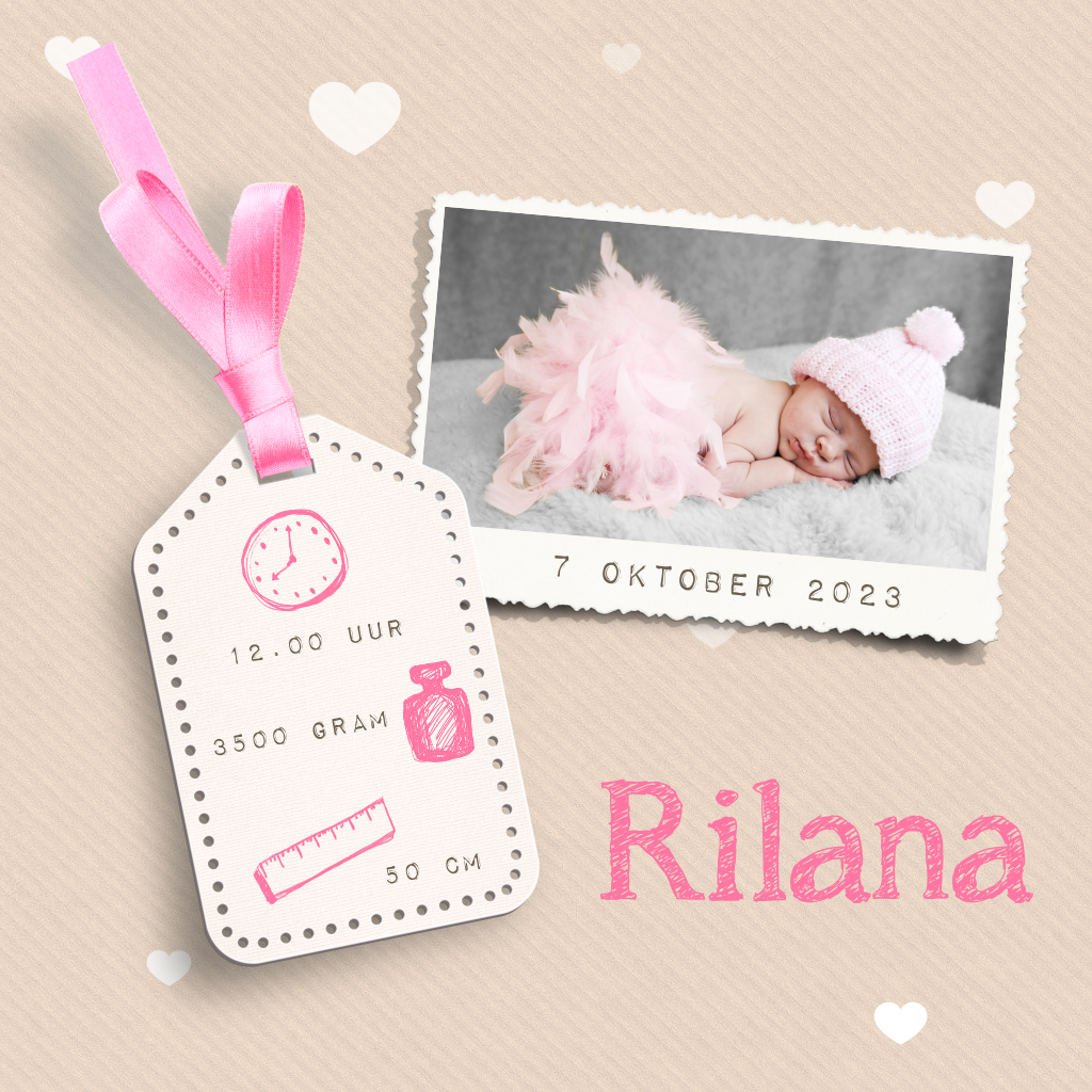 Stoer geboortekaartje met label aan roze lint. Schrijf bij de leuke geboorteicoontjes het gewicht, de geboortetijd en de lengte van je baby.