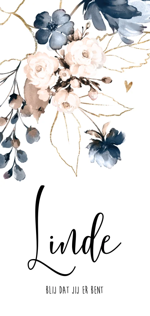 Uniek geboortekaartje meisje met botanische blauwe en goud kleurige bloemen.