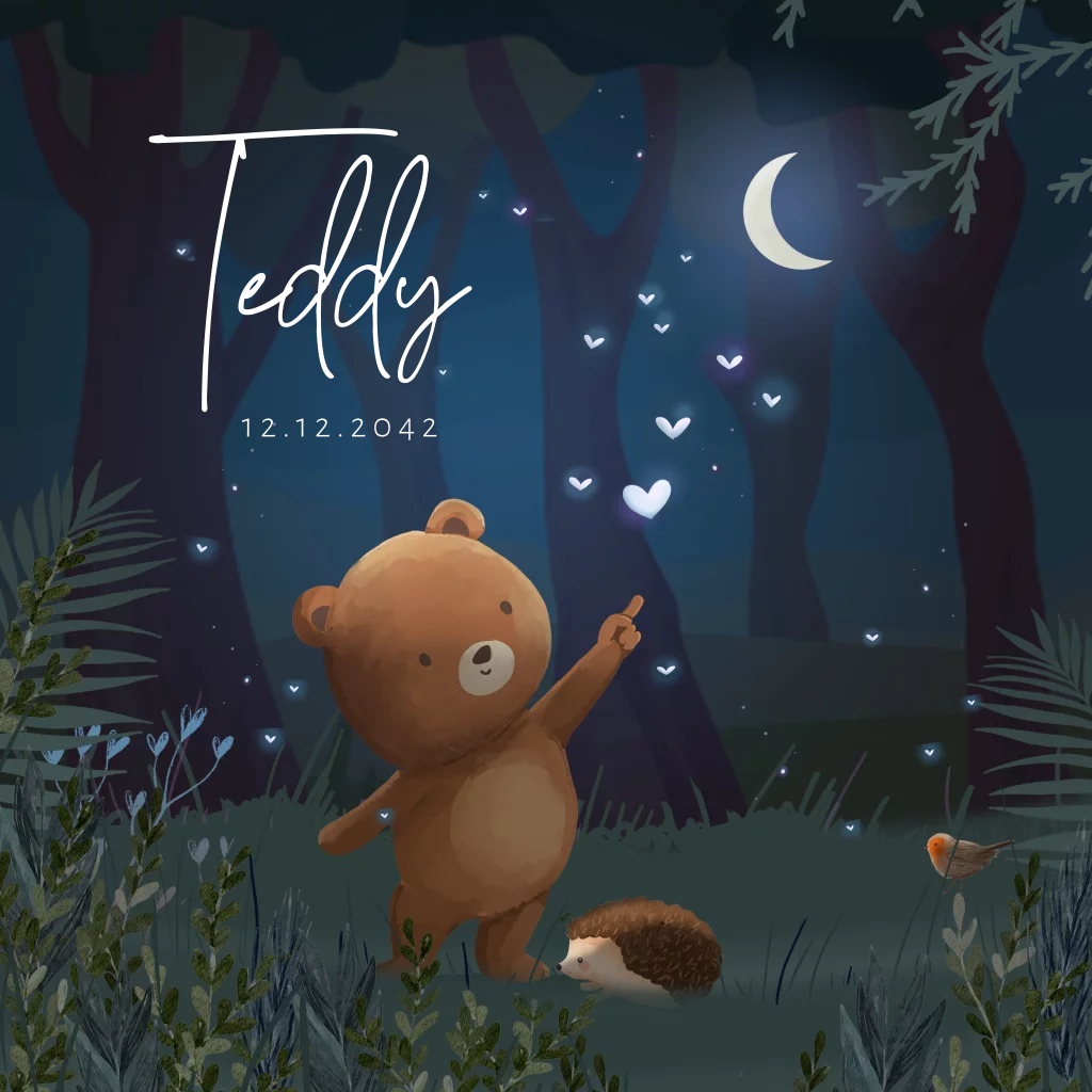 Geboortekaartje voor een meisje of een jongen met een lieve beer in het bos. Met hartjes, maan en een egeltje.