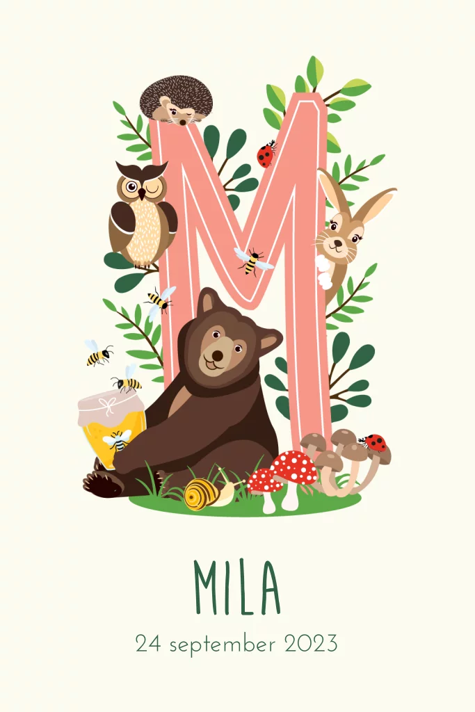 Geboortekaartje met bosdieren voor een meisje met de letter M van het alfabet. (3689)