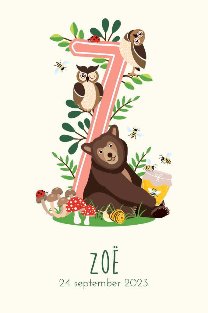 Geboortekaartje voor meisje met alfabet letter Z en bosdieren