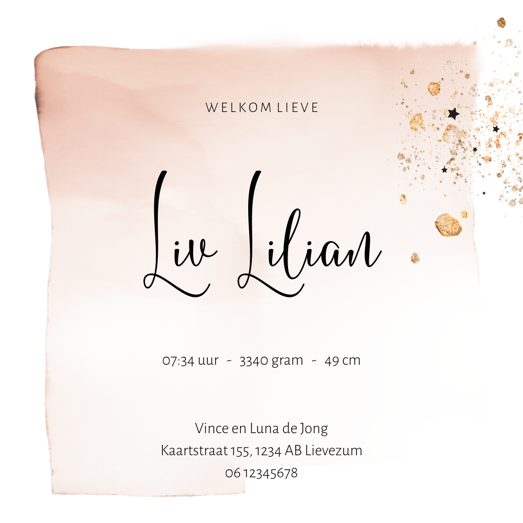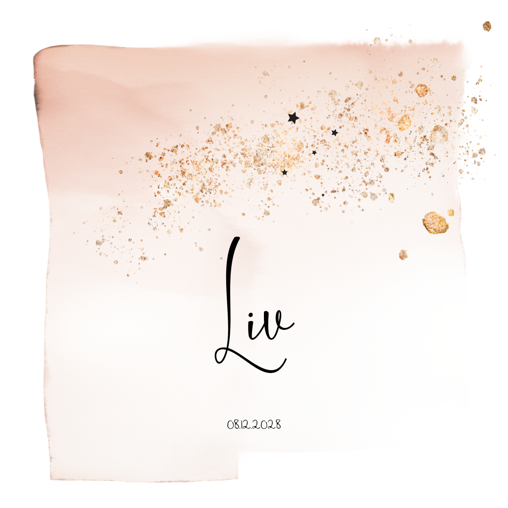 Modern geboortekaartje Liv roze watercolor vlak met goudlook voor een meisje. (4510)