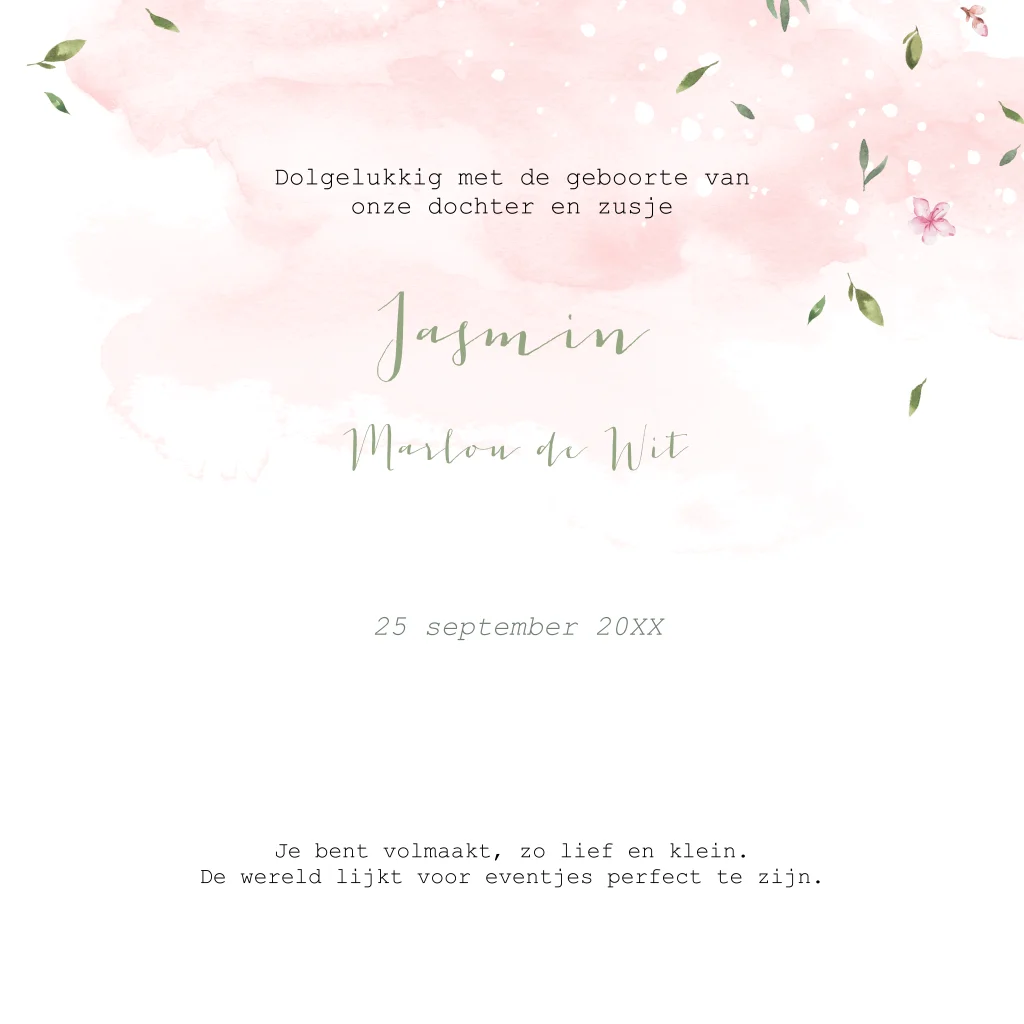 Een vrolijk en speels geboortekaartje voor een meisje, met een grote broer die de fiets rijdt, de grote zus achterop en het kleinste zusje in het mandje voorop. Zachte waterverfkleuren en vallende bloemetjes en blaadjes rondom geven het ontwerp een dromerige en natuurlijke uitstraling. Pas het ontwerp eenvoudig aan naar eigen wens in onze online editor.