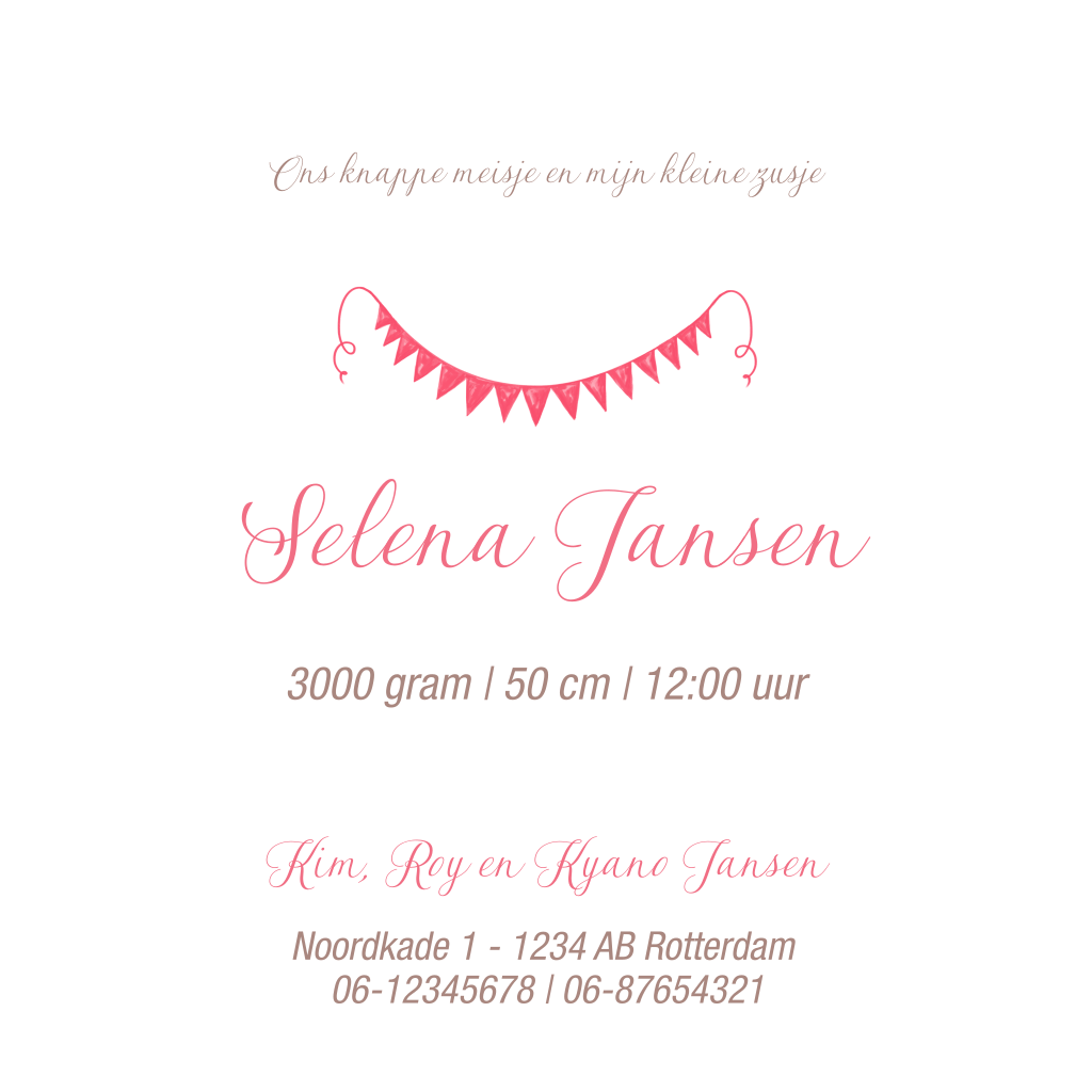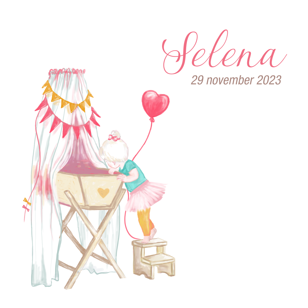 De grote zus kijkt over het randje van de wieg en heeft een ballon bij zich. Zo schattig om te zien! Een klassiek geboortekaartje om van te houden!
