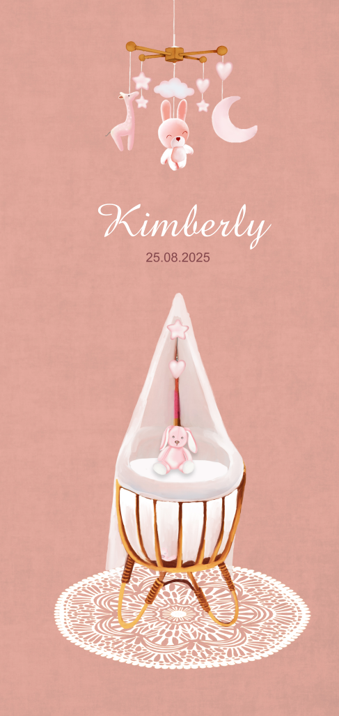 Leuk geboortekaartje met mooi wiegje en mobiel versierd met konijntjes en girafje. (4090)