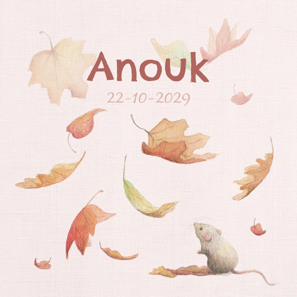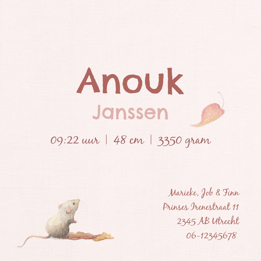Geboortekaartje zachtroze, muisje met herfstblaadjes