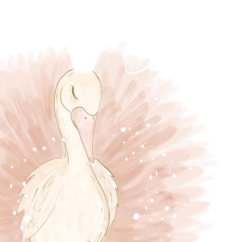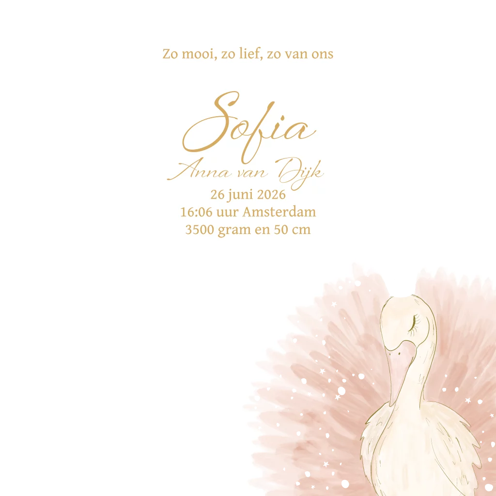 Een schattig geboortekaartje met een zwaan, kroon en roze waterverf. Pas zelf de teksten aan. (4666)