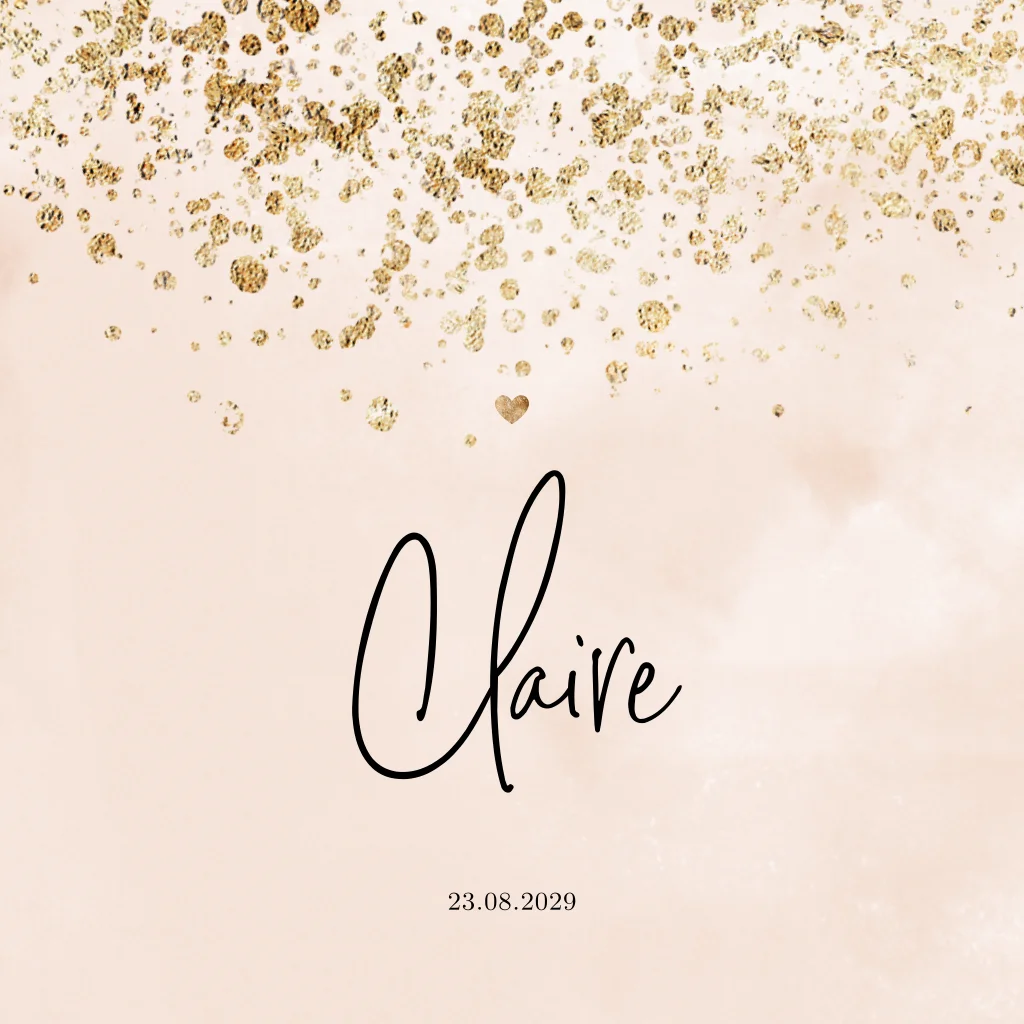 Hip waterverf roze geboortekaartje meisje met goud kleurige spetters.