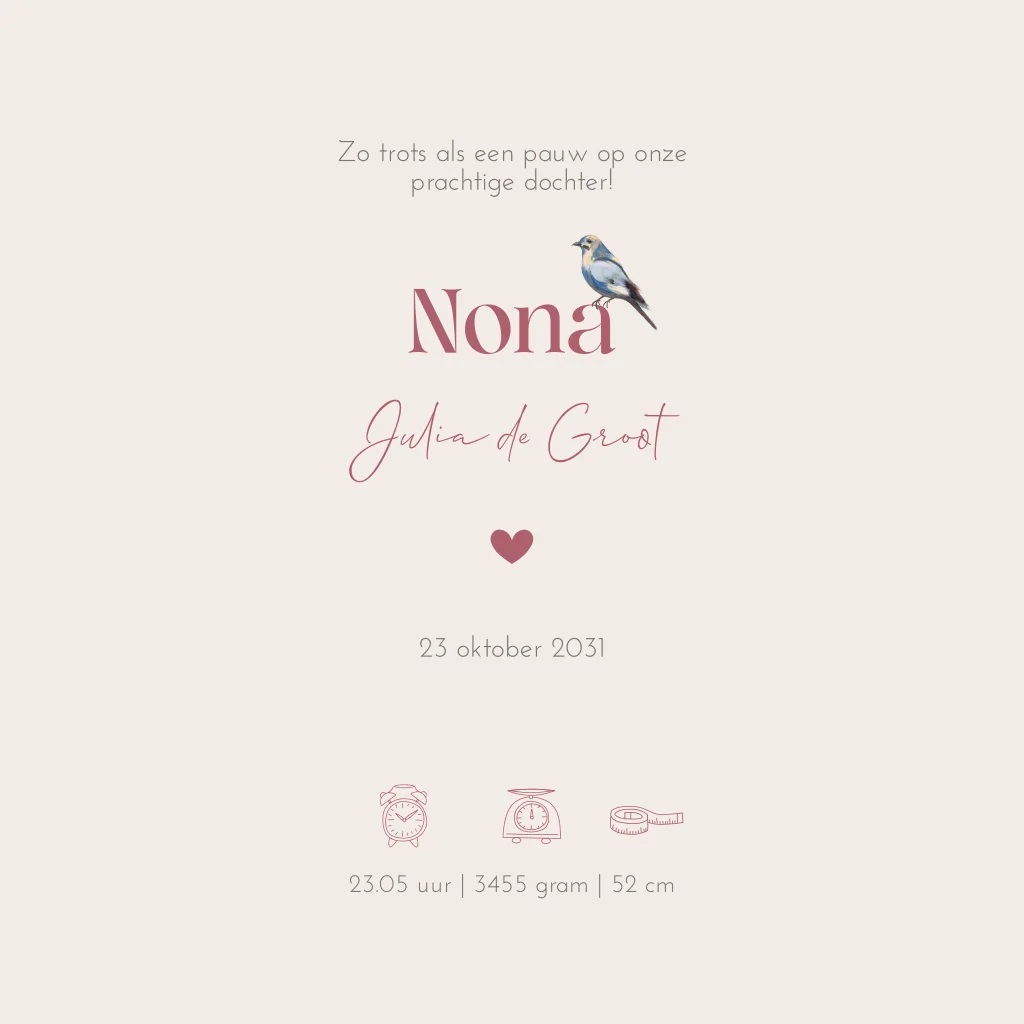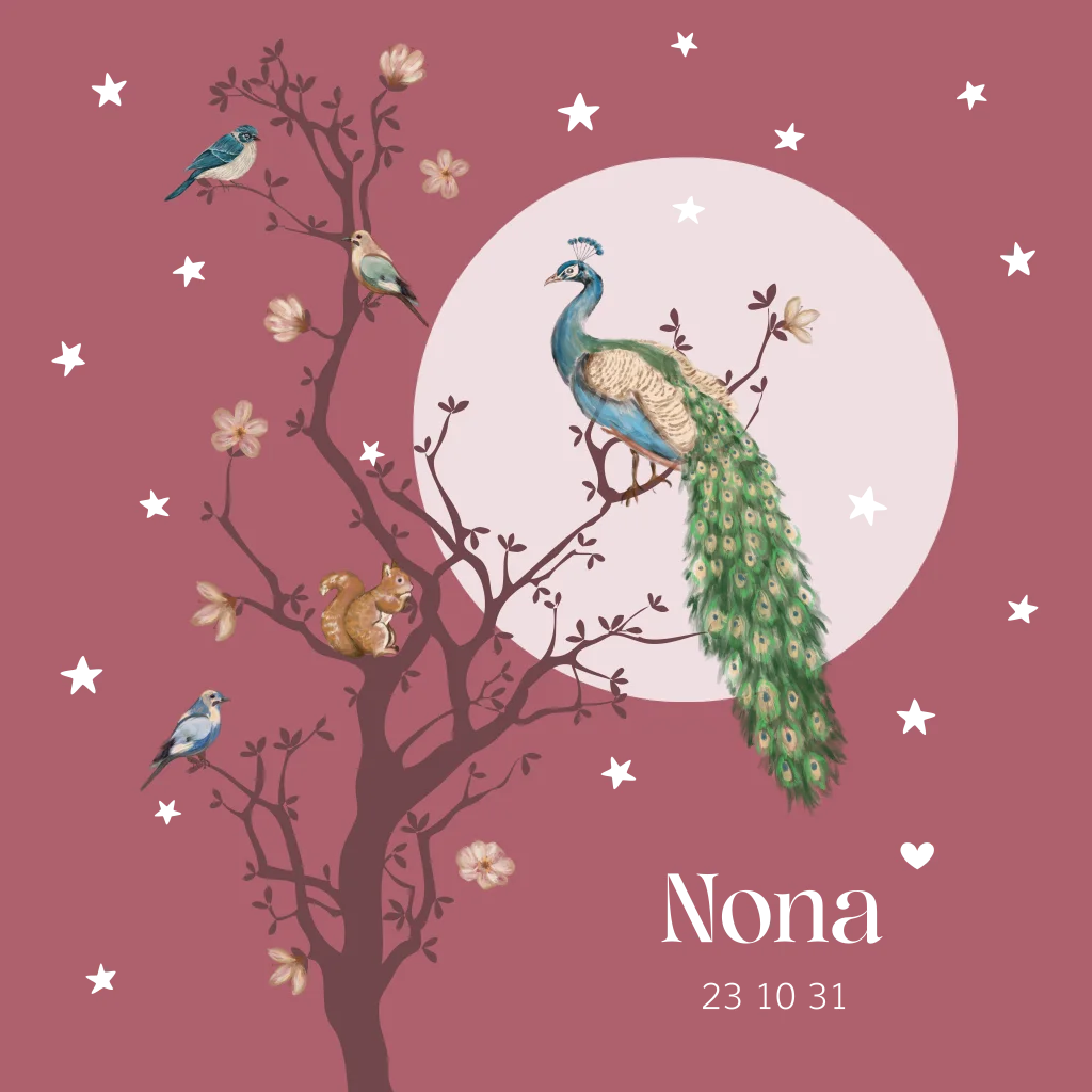Dit luxe geboortekaartje met goudfolie en mooie waterverf illustraties van een pauw, diverse vogeltjes, een eekhoorn en bloemetjes kun je zelf aanpassen. Door de kleuren, tekst en het lettertype te veranderen kun je deze geboortekaart naar eigen wens personaliseren.
