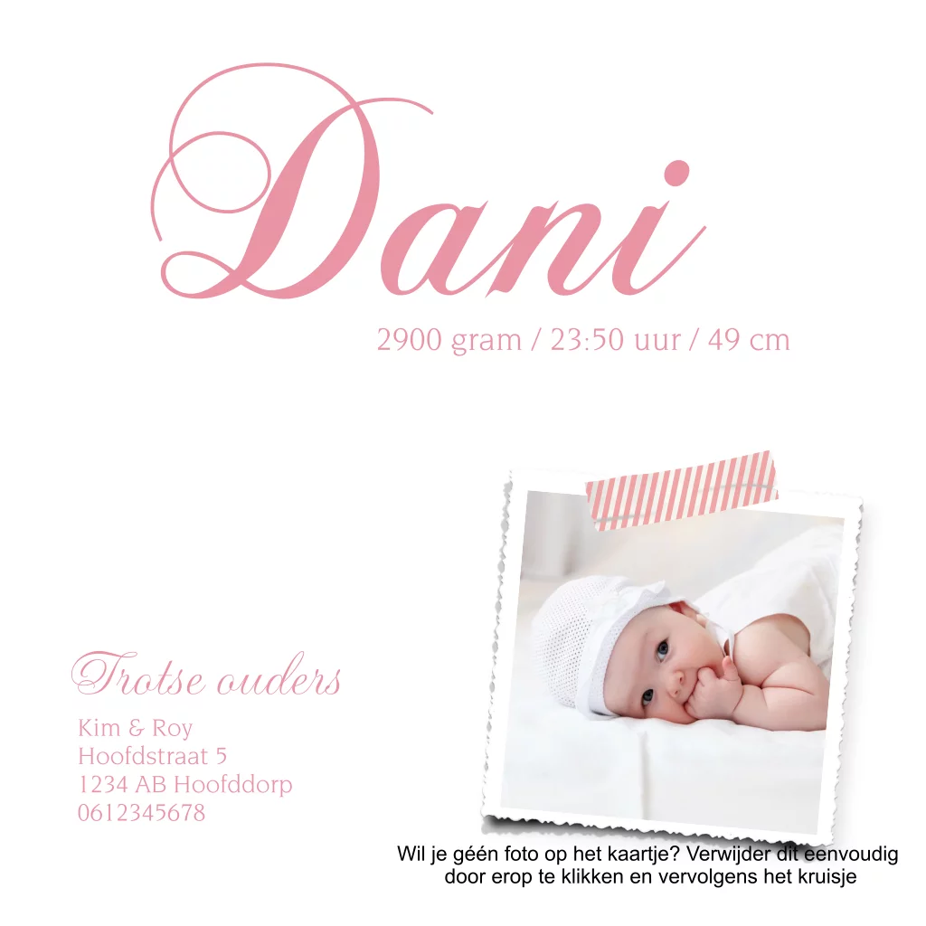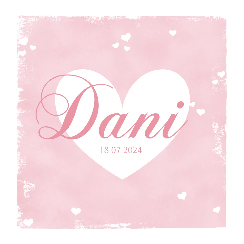 Klassiek geboortekaartje met watercolor voor een meisje. De lieve hartjes passen goed bij het ontwerp. Aan de binnenkant vind je een vintage kader met een babyfoto erin. Vervang deze foto en schrijf een eigen gedichtje.