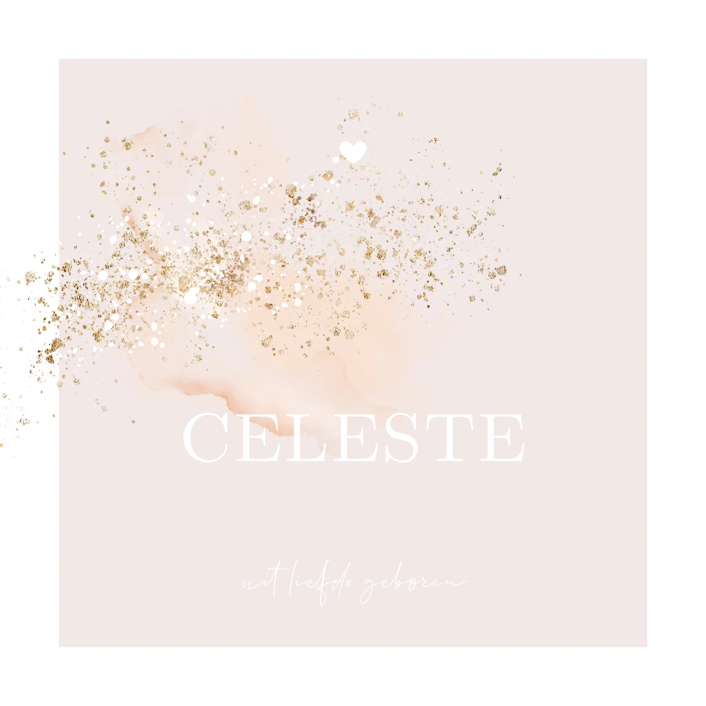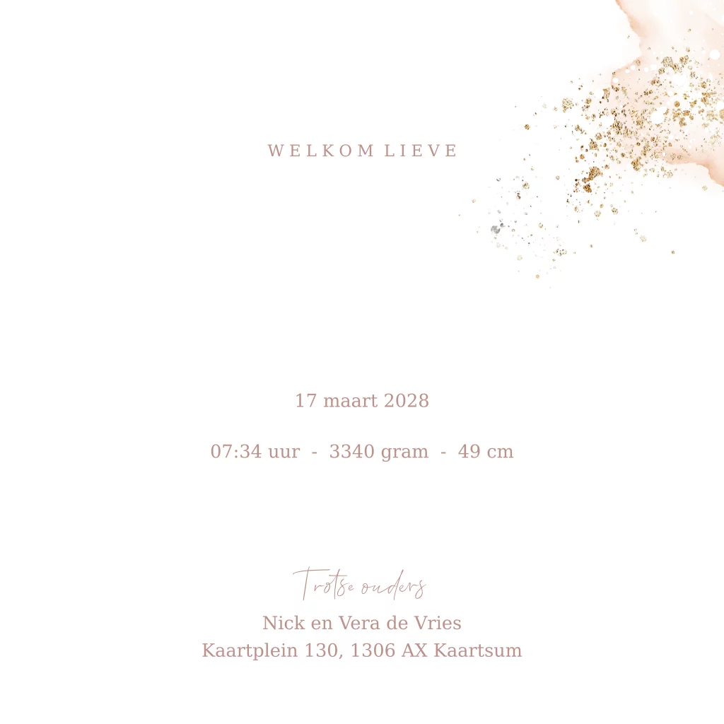Hip geboortekaartje meisje. Roze met foliedruk spetters.