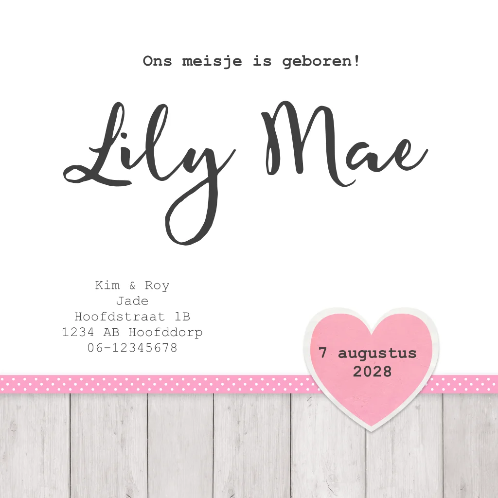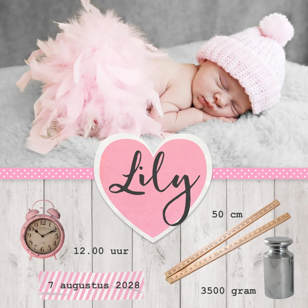 Laat jij een fotograaf komen voor het maken van een babyfoto, of maak je liever zelf een foto van je kindje? Voor dit meisjes geboortekaartje is het leuk als je een foto van je slapende baby maakt en dit op de kaart plaatst. Zo maak je zelf je geboortekaartje origineel. Je kunt het hartje met de naam van je dochter erin plaatsen waar jij wilt en ook de centimeter, het klokje en het gewichtje verplaatsen.