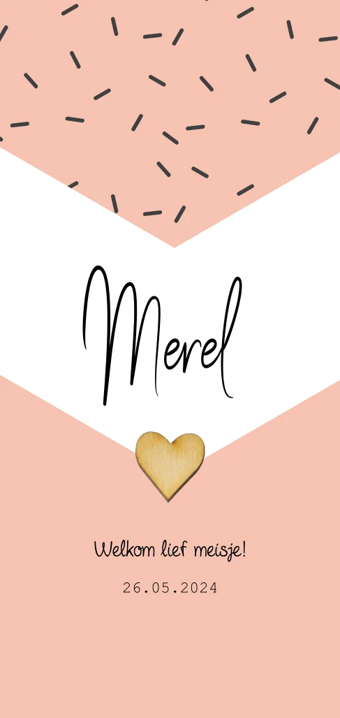 Hip geboortekaartje langwerpig met confetti en echt houten hartje
