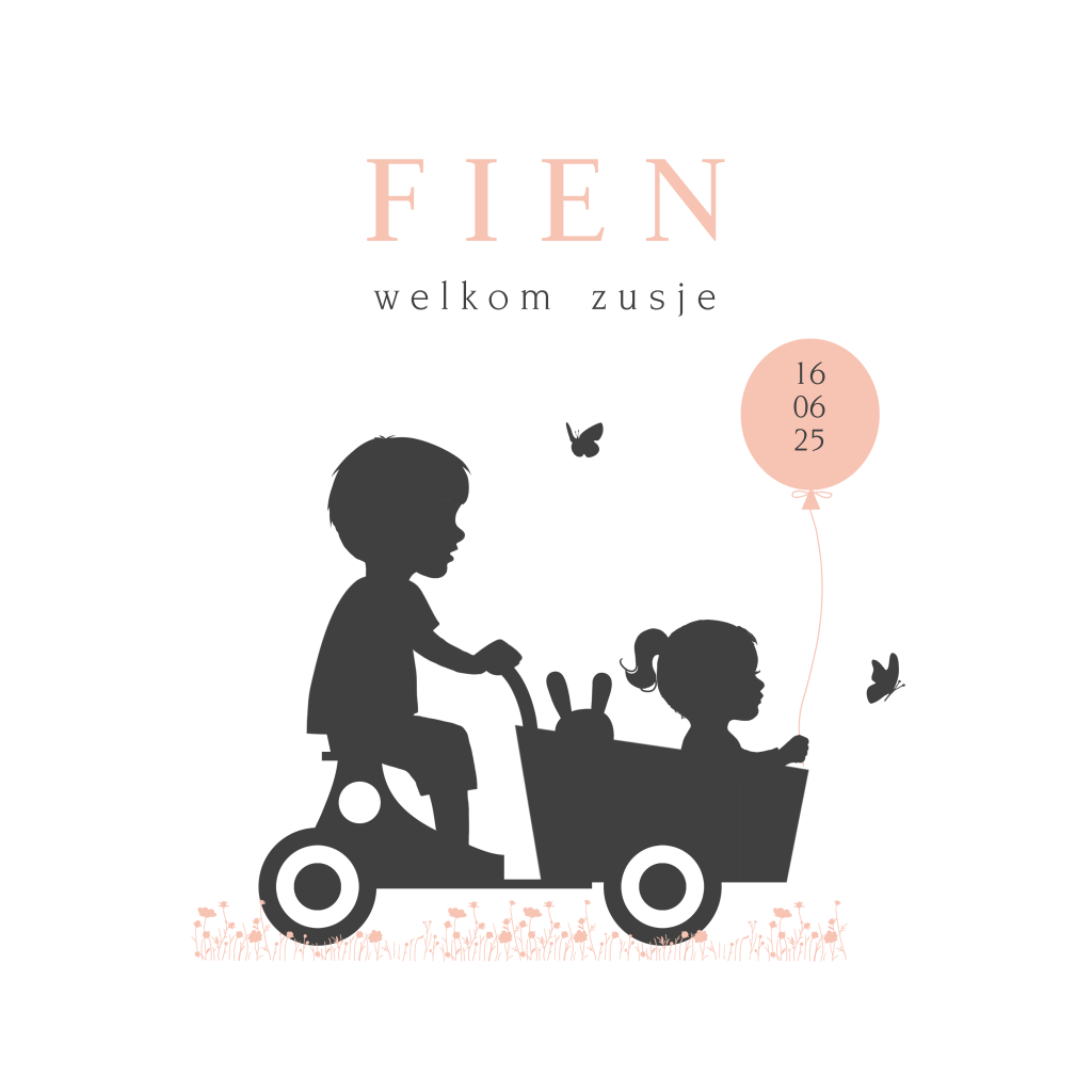 Hip geboortekaartje meisje met broertje in bakfietsje