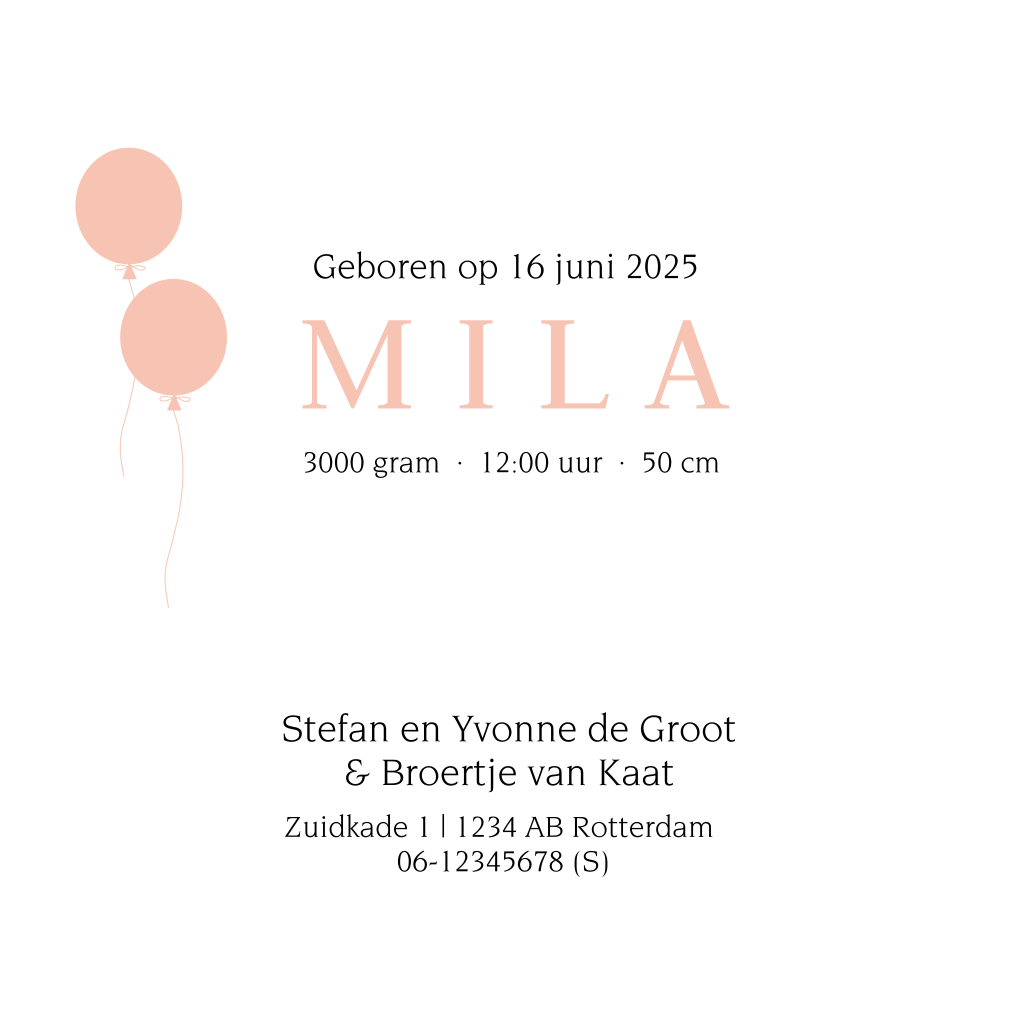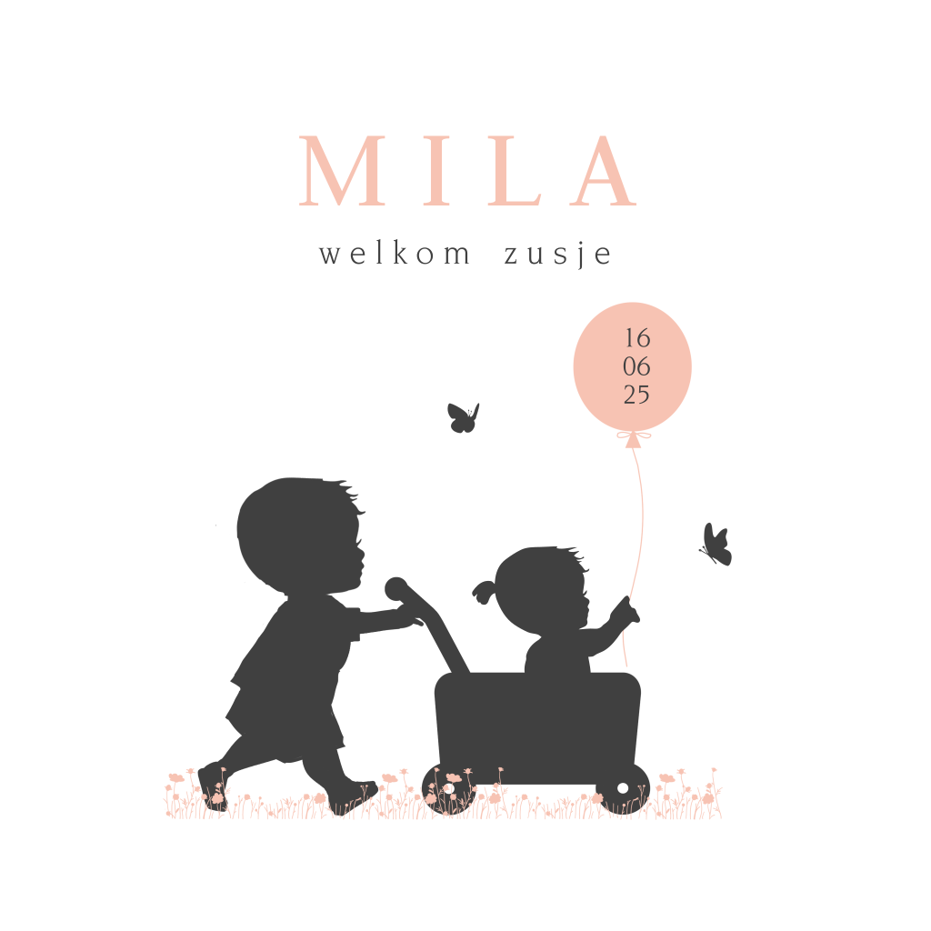 Hip geboortekaartje voor de geboorte van een 2e kindje meisje met grote broert achter de loopkar.